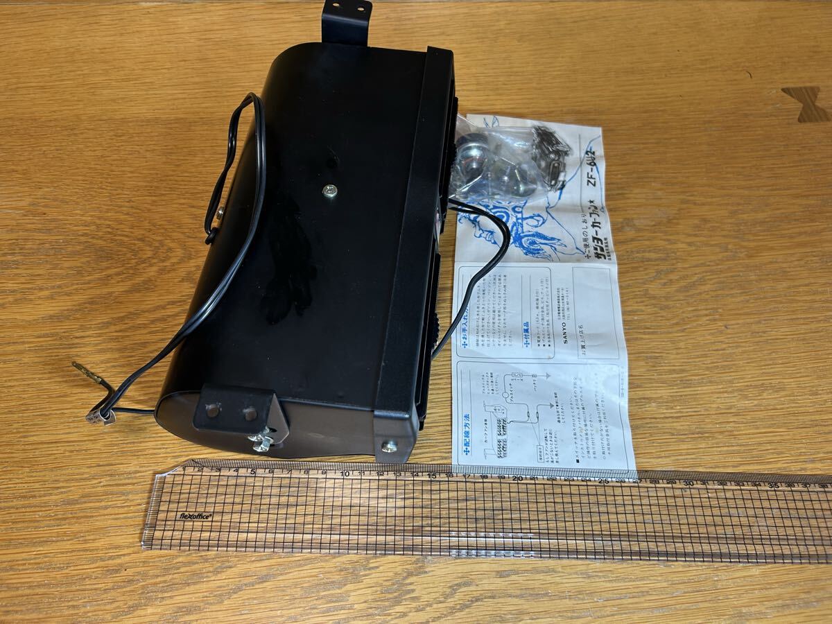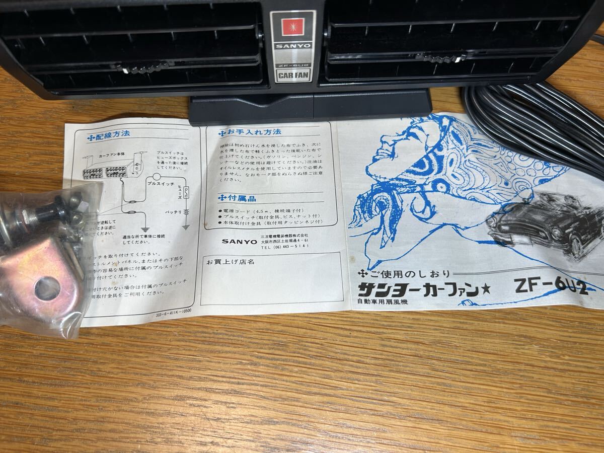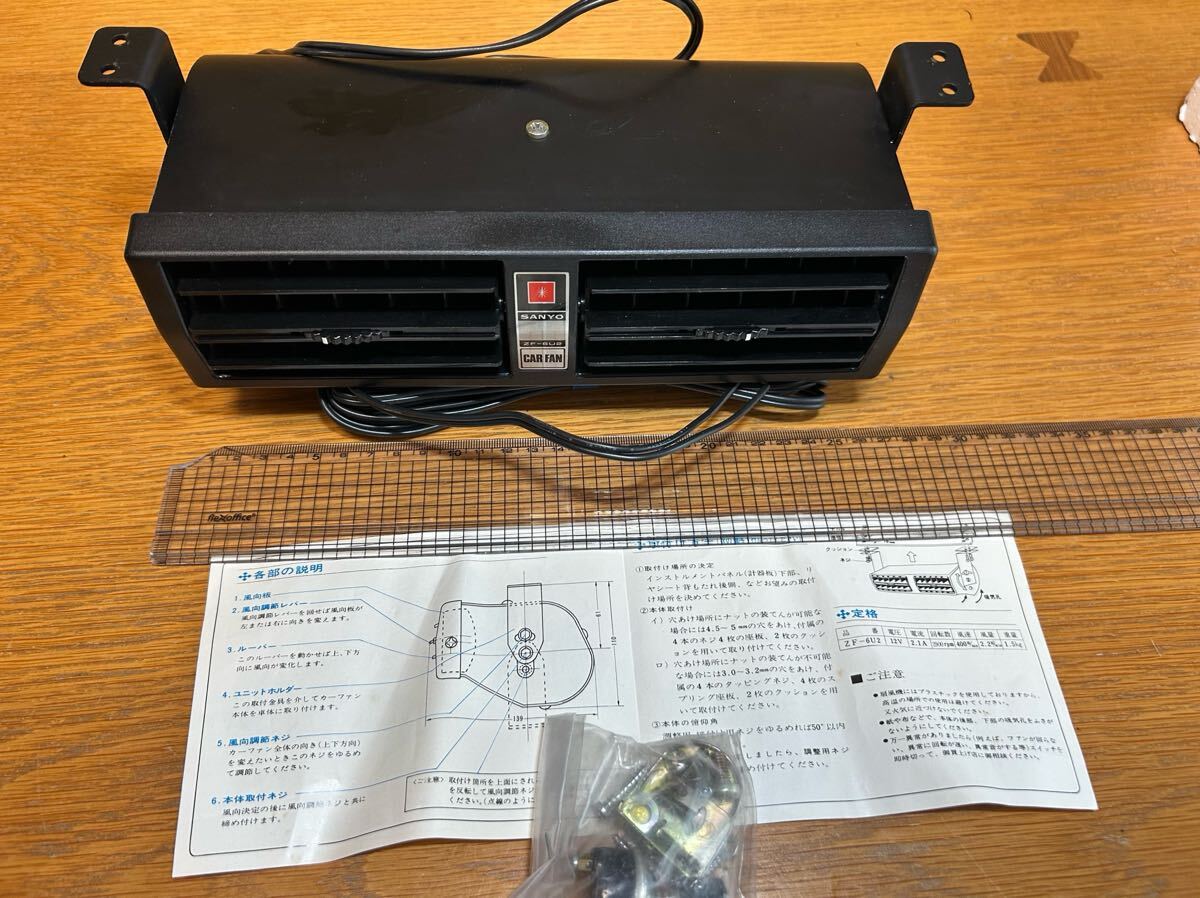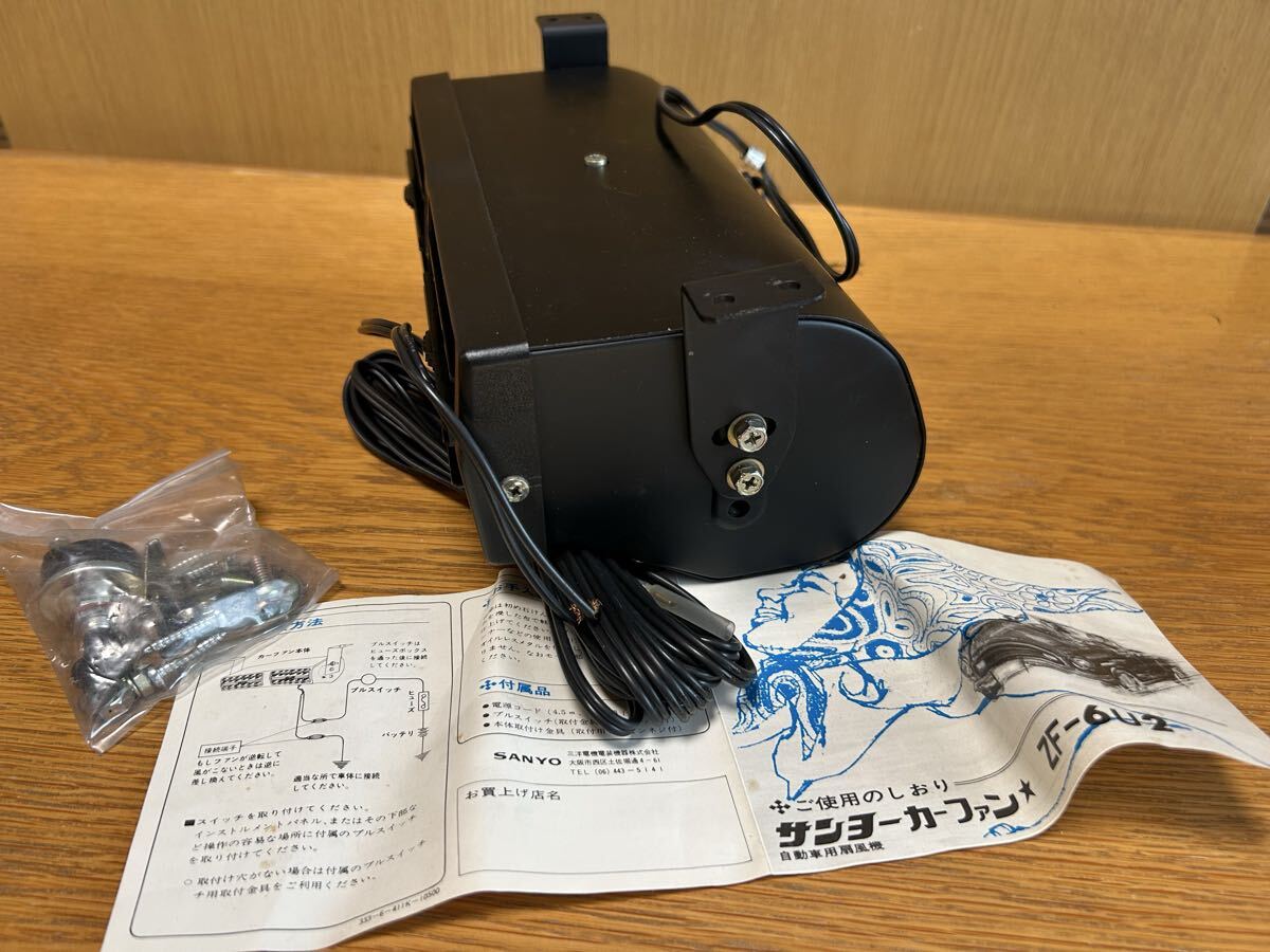 サンヨー製カーファン(扇風機)未使用品になります。大変珍しい商品だと思います。ダッシュボードの下に吊り下げるタイプでスイッチや取り付けステー説明書も付属しております。本体サイズは幅25センチ奥行き14センチ高さ9センチほどです。小型のため旧車の軽自動車にも取り付け可能なサイズです。