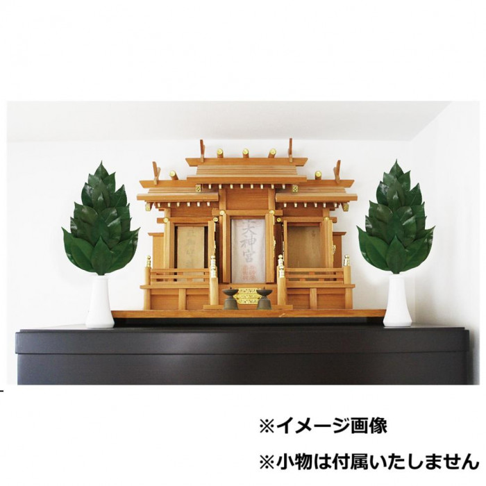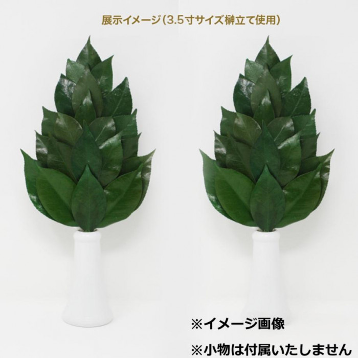 | 本物の榊をプリザーブド加工しております。丹波産高級椿葉を使用しました。大変な水換えが不要でみずみずしさが長く続きます。椿榊を二束重ねることにより、立体感を演出しました。葉、束の開き具合を調整できます。 |