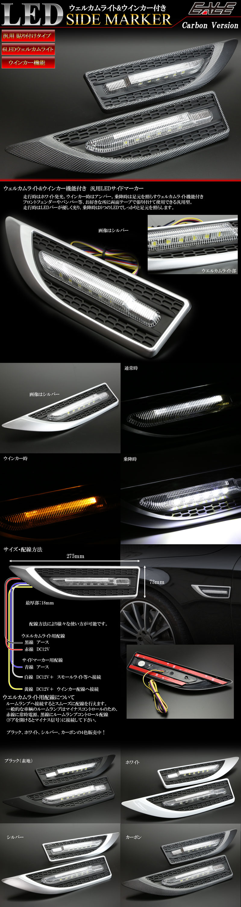ウェルカムライト&ウインカー機能付き 汎用 LED サイドマーカーランプ フロントフェンダーやバンパー等、お好きな所に両面テープで貼り付けて使用できる汎用タイプ。 走行時はLEDバーが優しく光り、乗降時は6つのLEDでしっかりと足元を照らします。 ブラック、ホワイト、シルバー、カーボンの4タイプを販売中です。 その他のカラーは こちら ライト点灯時にウインカーを出すとホワイト/アンバーの交互点滅になります。 |