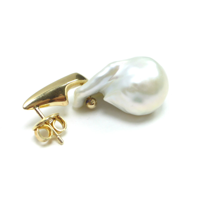 | 最高級の淡水パールを用いて、個性的なフォルムのパールをスタイリッシュにデザインしたボッテガの「バロックパール」シリーズ。 こちらはシャープなスタイルのゴールドパーツに、大粒の淡水パールをあしらったラージパール ピアスです。 立体感のあるバロックパールによって耳元を上品に彩り、エレガントな表情を魅せるジュエリーピアス。 天然の偶然が生み出すユニークな形状がクォリティの高い一粒となって、カジュアルからセミフォーマルまで幅広いスタイルに活用できます。 |