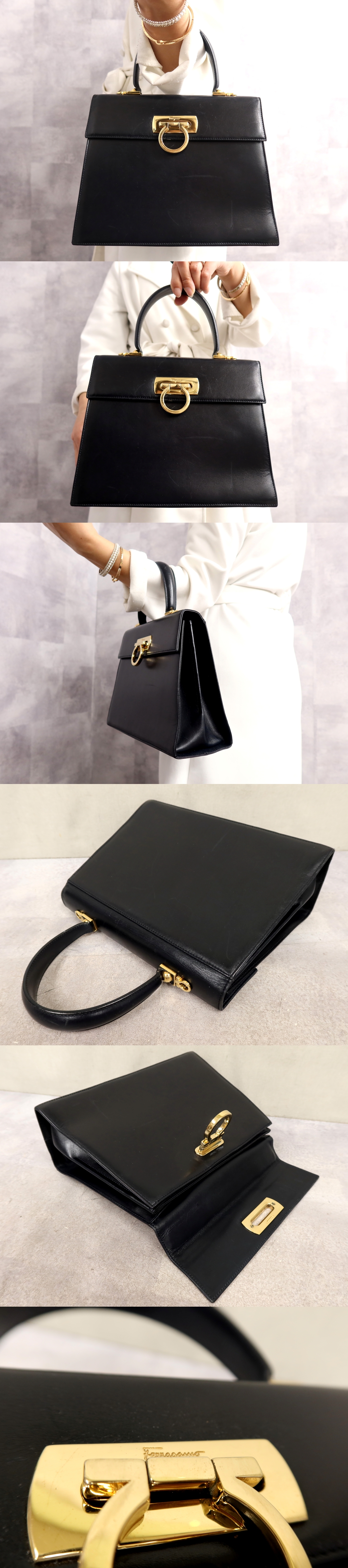 ●超美品●Salvatore Ferragamo フェラガモ●ガンチーニ●カーフ レザー 本革●ハンド バッグ●黒●ゴールド金具●B5 収納 かばん●Js64790 [浏览原始页面]