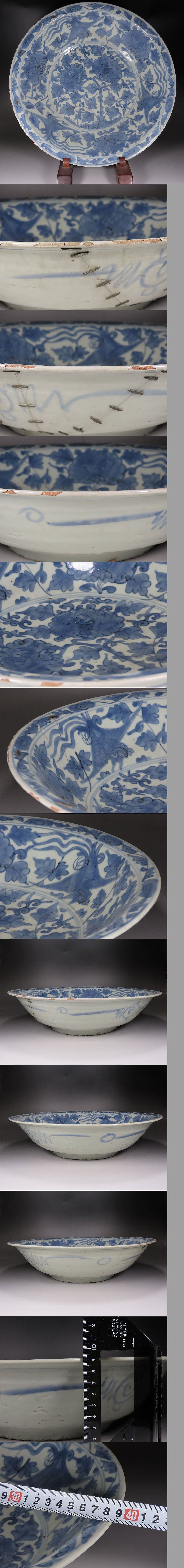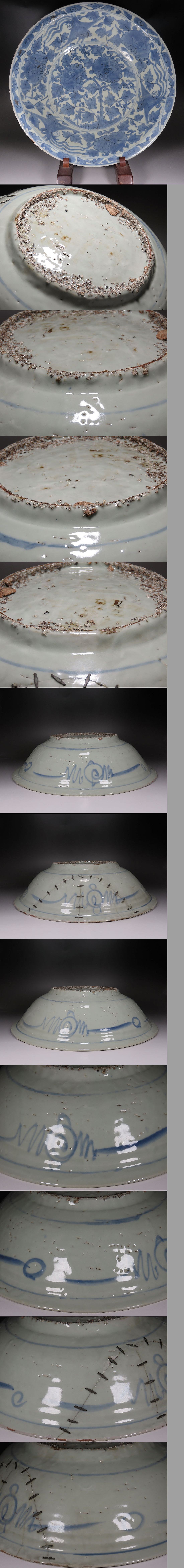 | 中国の明時代の陶器.染め付け釉の模様.呉須大振りサイズ皿.傷あり昔の直しあります。 | ||||||||||||||||||||