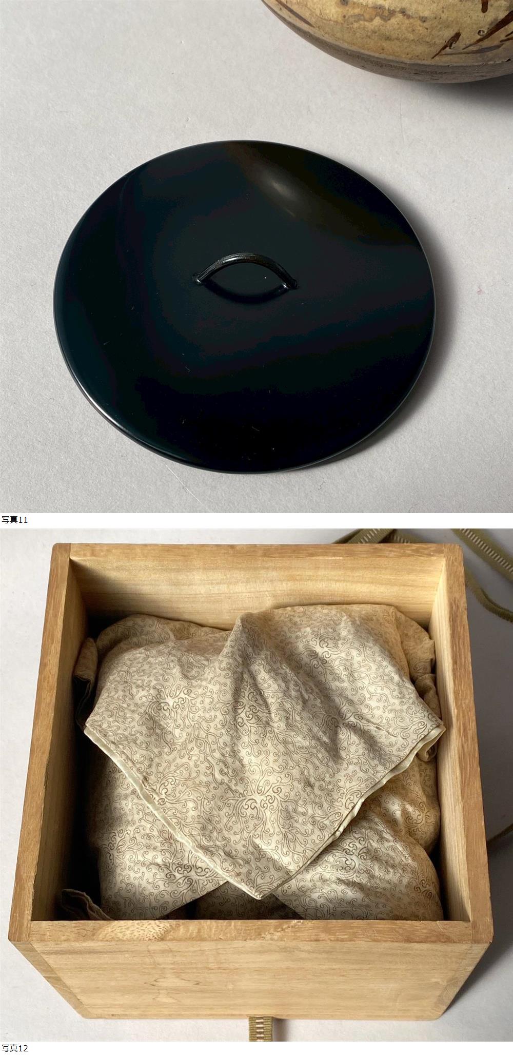 この度は数あるオークションからご覧いただき、ありがとうございます。 古唐津?磁州窯? 算盤玉形 双耳壷 蓋付き 見立ての水指 布 合箱付き 茶道具 です。 ■商品説明■ 蓋を誂え、水指に見立てられた双耳壷です。 浅学にて、どちらの焼物か判断が付かず、唐津のカテゴリをお借りして出品しております。 布に包まれ合箱に入れられており、大切にされてきたものと思われます。 画像にてご判断頂ける方、どうぞよろしくお願いいたします。 ■サイズ(約)■ 直径16㎝、高さ10㎝(蓋を含まず) ■商品状態■ こちらは古い物となり、商品状態・時代感を損なわぬ様、乾拭きなどの簡易清掃にて出品しております。 とても古い物と思われるため、全ての汚れを落としきってはおりません。 時代・保管・使用に伴うスレ、ソゲ・ニュウなどの傷、落としきれない汚れ等ございます。 詳細な状態につきましては画像にてご判断頂きご入札をお願い致します。 ※敷板は撮影用となり、付属致しませんのでご承知おきください。 ※下記、発送詳細・支払い方法・その他、注意事項をご一読ください。 |
