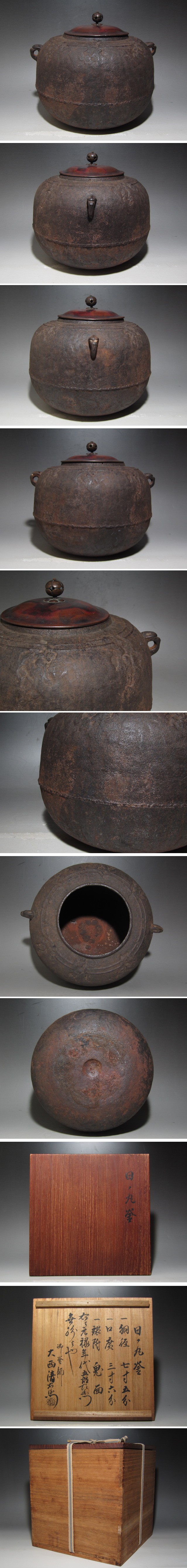 時代ある日の丸釜です。 見事な鉄肌で、どっしりとした風格と安定感がある作品です。 箱蓋裏に大西清右衛門の極めがあります。 【大西清右衛門(おおにしせいえもん)】 千家十職の釜師。大西家は室町時代後期から400年以上続く京釜師の家。 四代目当主が清右衛門をなのり、六代目以降九代目をのぞき、代々の当主は清右衛門という名を継いだ。 京都市中京区の三条釜座(かまんざ)に工房があり、「大西清右衛門美術館」も併設されている。 現在は十六代清右衛門が当主。 サイズ 直径24cm/高さ20cm(多少の誤差はお許しください) 状態 一見して疵やヒビ・直しは見られません。 骨董品という事をご勘案頂き、時代経過のスレや、小さな傷がある場合があるかもしれませんのでご承知置きください。 | |||