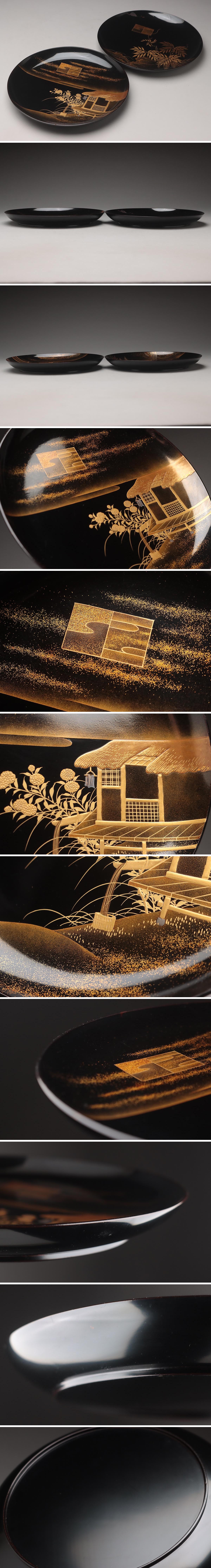 | ◆ 時代漆器 滝に藤金蒔絵皿・葛屋金蒔絵皿 二枚・蒔絵菓子皿・蒔絵丸皿 和食器 茶具 漆工芸 古美術 ◆