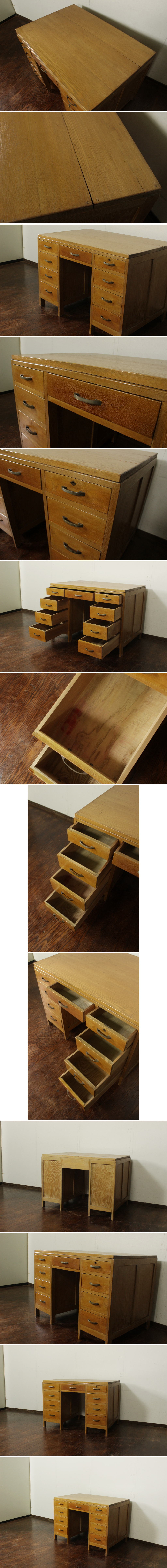 | 商品紹介 | 昭和期の木製両袖机です。 片側に引き出しを備えた、昔ながらの作業机らしい素朴な佇まいが魅力です。 引出しは全部で九杯あり、細かな物の整理にも便利な収納力を備えております。 使い込まれた木味と落ち着いた風合いが、空間にあたたかみを添えてくれます。 日常の作業台としてはもちろん、展示台や店舗什器としても扱いやすい一台です。 古道具、昭和レトロ、実用兼ディスプレイ用途をお探しの方におすすめです。 |