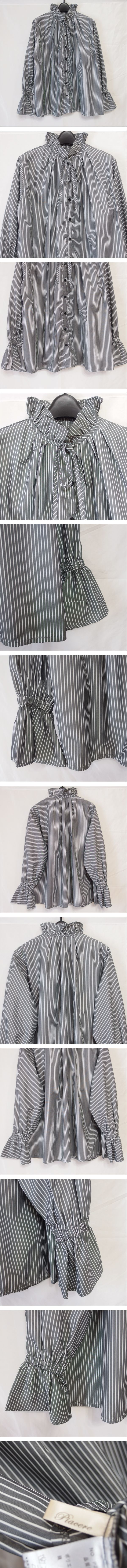 piacere ◆ ピアチェーレ フリル スタンドカラー リボン付き 長袖 ストライプ柄 ブラウス(グレー)サイズF ◆USED美品 S | |||