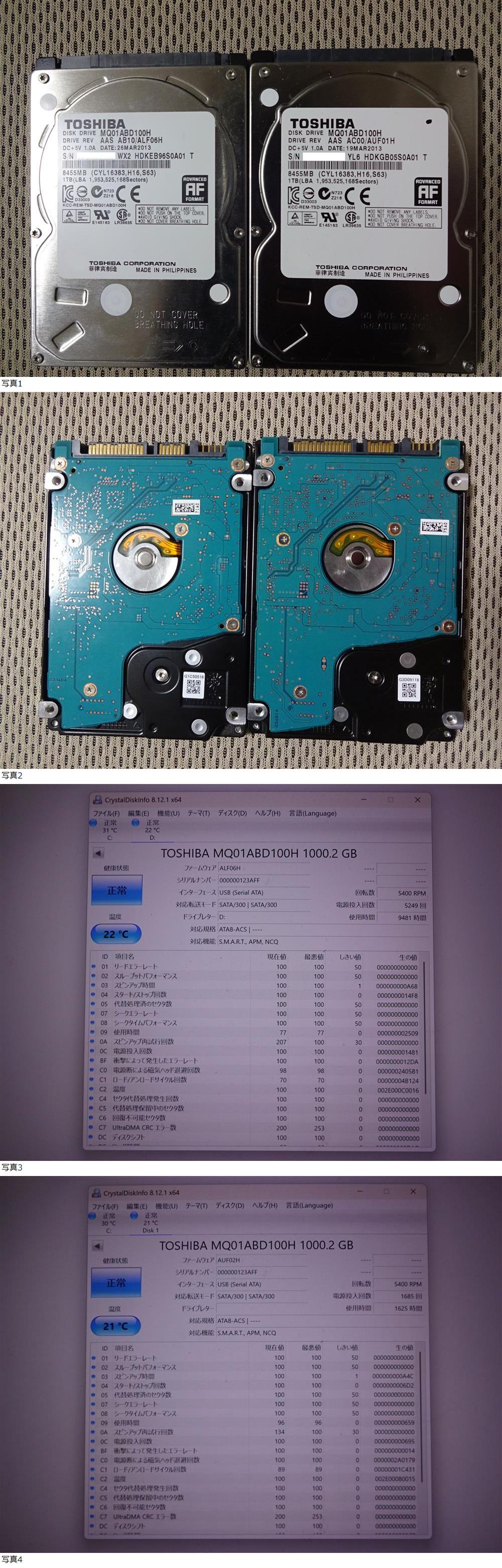 ・東芝製 SSHD ハイブリッドHDD(MQ01ABD100H)1TB×2