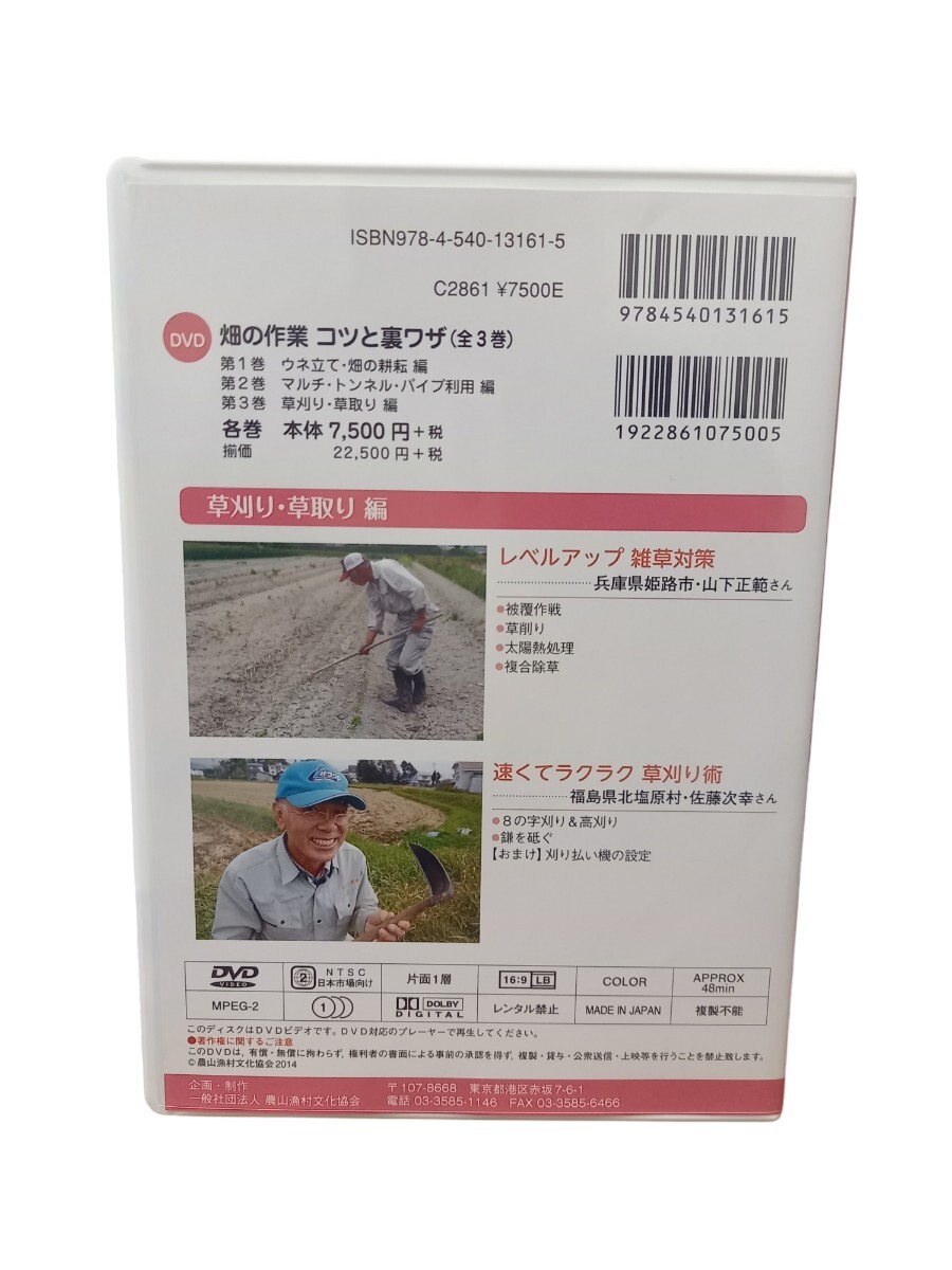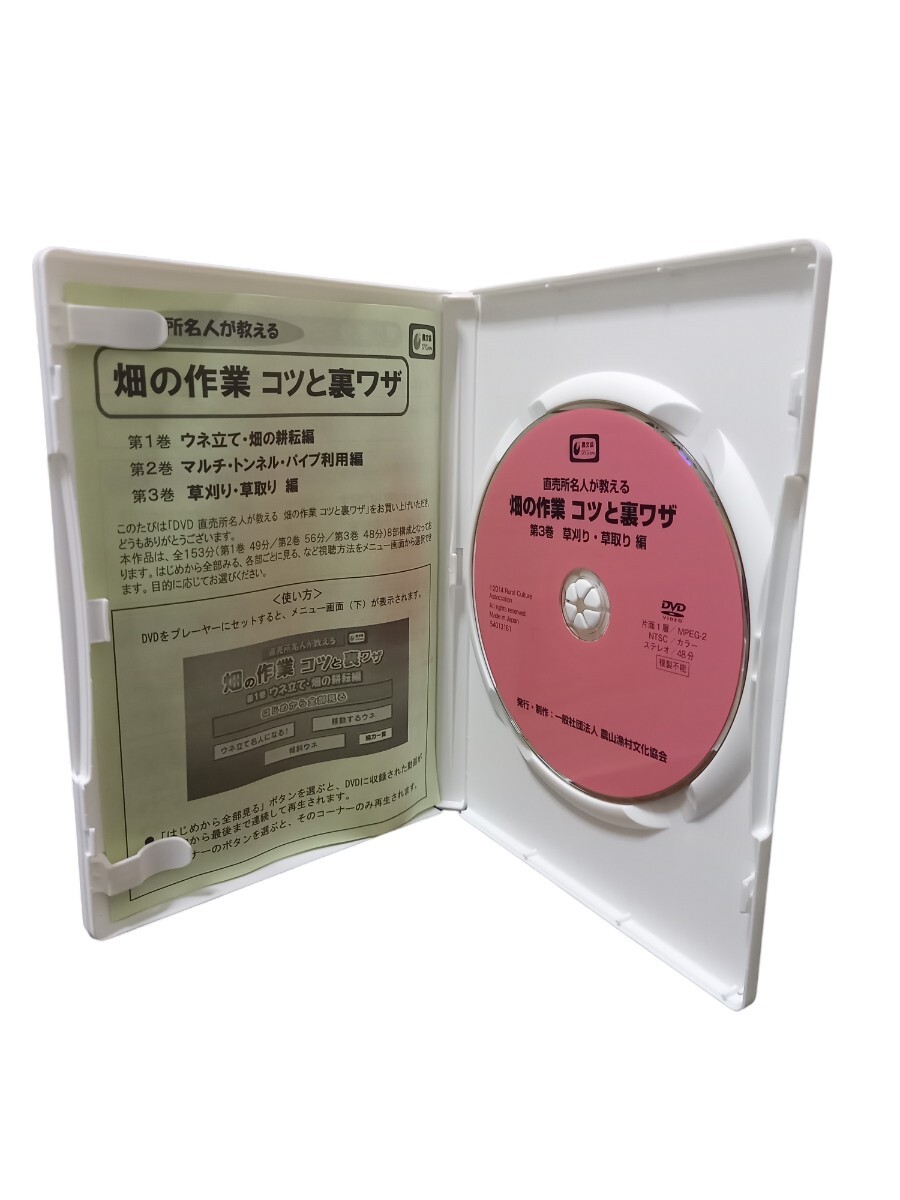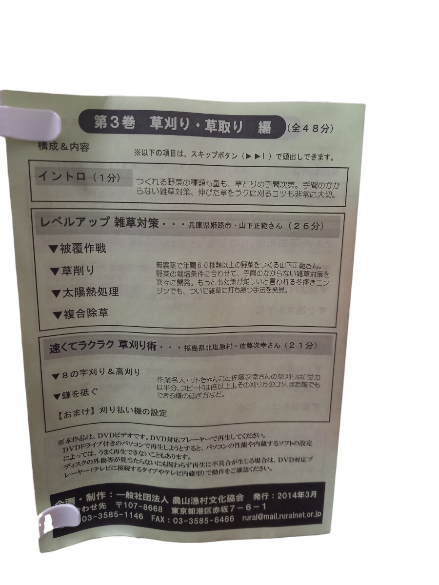 直売所名人が教える畑の作業 コツと裏ワザ DYD第3巻 企画・制作:農文協 草刈り・草取り 編48分 リーフレットついてます(多少曲がりがありますが、状態良好です)ケース状態良好です、盤面は、再生に問題のない多少の浅キズがあります、エラーチェック済みです。 全48分は、大きく2つに分かれています。 ①レベルアップ 雑草対策 (26分) ②速くてラクラク 草刈り術 (21分) |