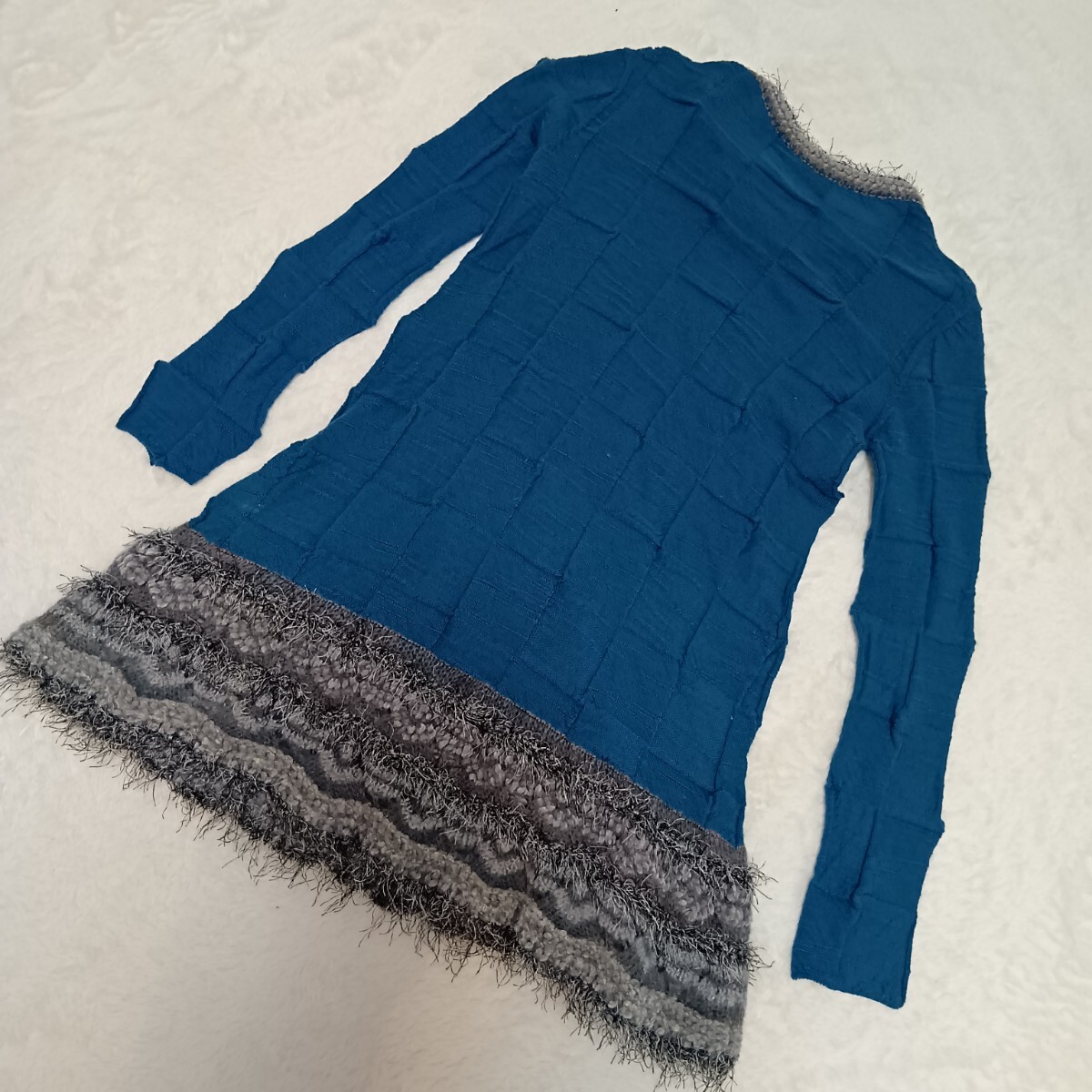 パッチワークのような美しい編み目がシンプルながら美しく手間隙を感じられる薄地のニットトップス です。