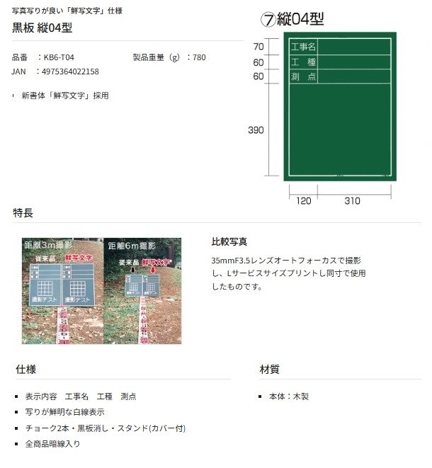 タジマ TAJIMA黒板 縦04型KB6-T04■特長・写真写りが良い新書体「鮮写文字」採用■仕様・表示内容 工事名 工種 測点・写りが鮮明な白線表示・チョーク2本・黒板消し・スタンド(カバー付)・全商品暗線入り■材質・本体:木製
