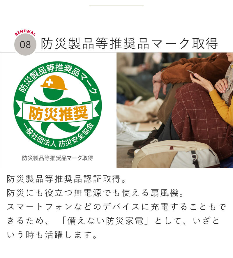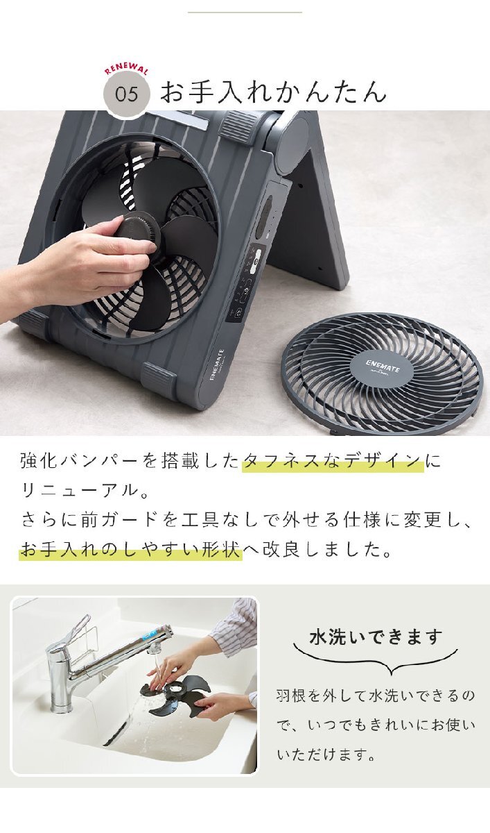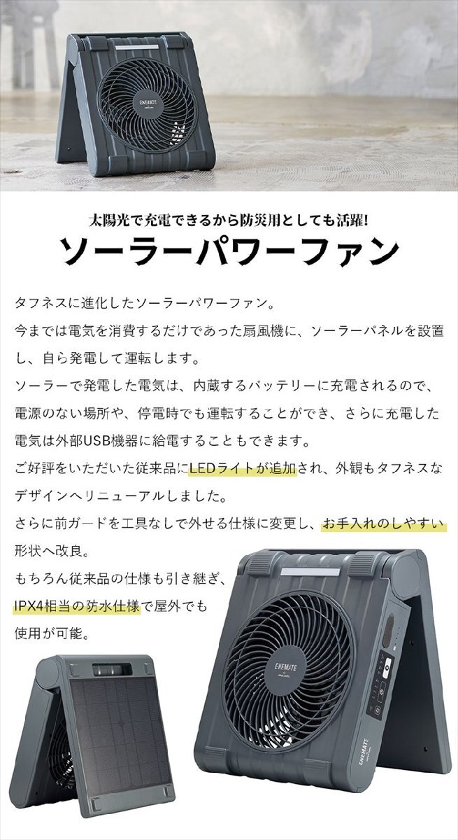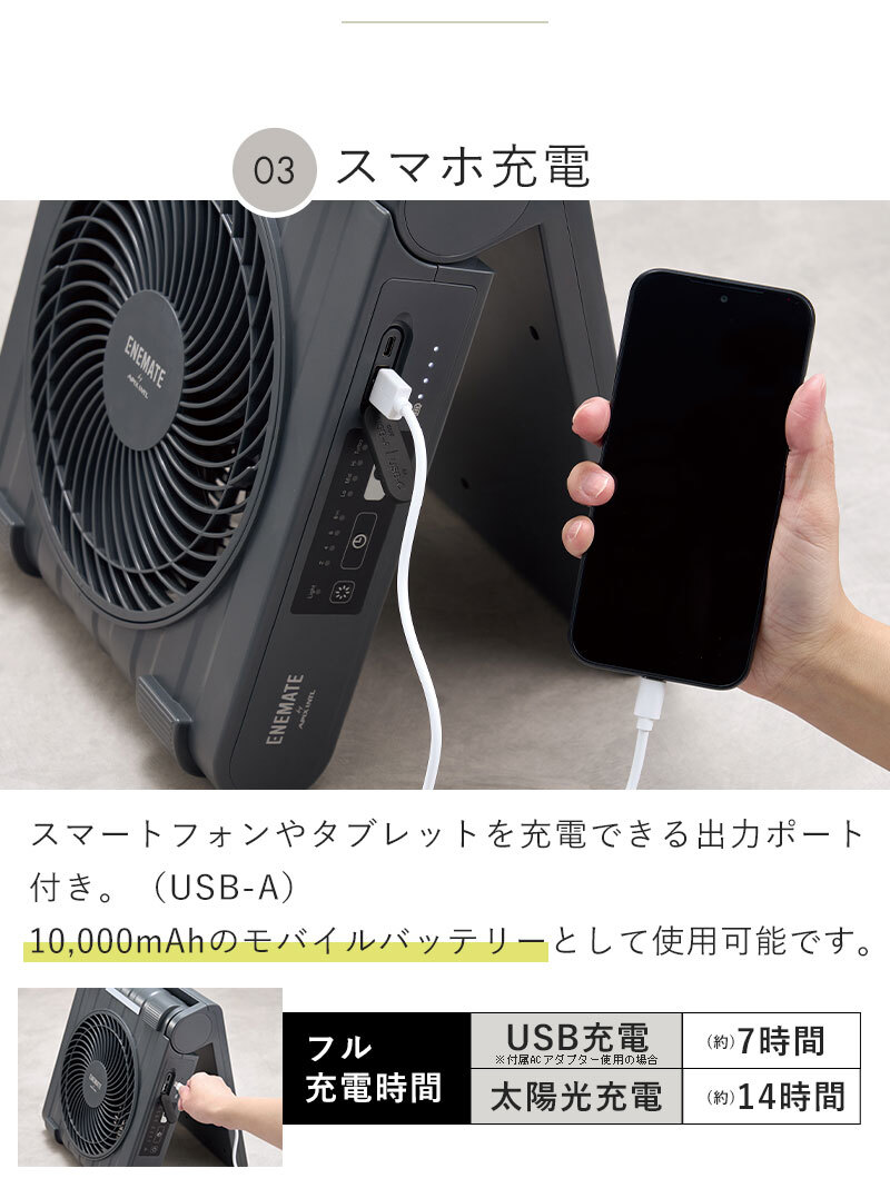 | 太陽光でもUSBでも充電できるソーラーパワーファン。 充電式で電源のないお部屋やアウトドアでも使える扇風機です。 充電しながらの使用もOK。 ソーラーパネル搭載なので太陽光充電もでき防災用としても活躍します。 10,000mAhのモバイルバッテリーとしてスマートフォンへ給電することもで可能。 パタンと折り畳めば厚さ95mmなので、収納も省スペース。 ハンドル付きなので片手で簡単に持ち運びできます。 室内でも屋外でもシーズンを通してお使いいただけます。 【バージョンアップ】 2022年に発売されたソーラーパワーファンが防水仕様・風量アップ・USB PD対応で急速充電/給電に改良されました。 また、収納袋も付属されてより使いやすくなっています。 |