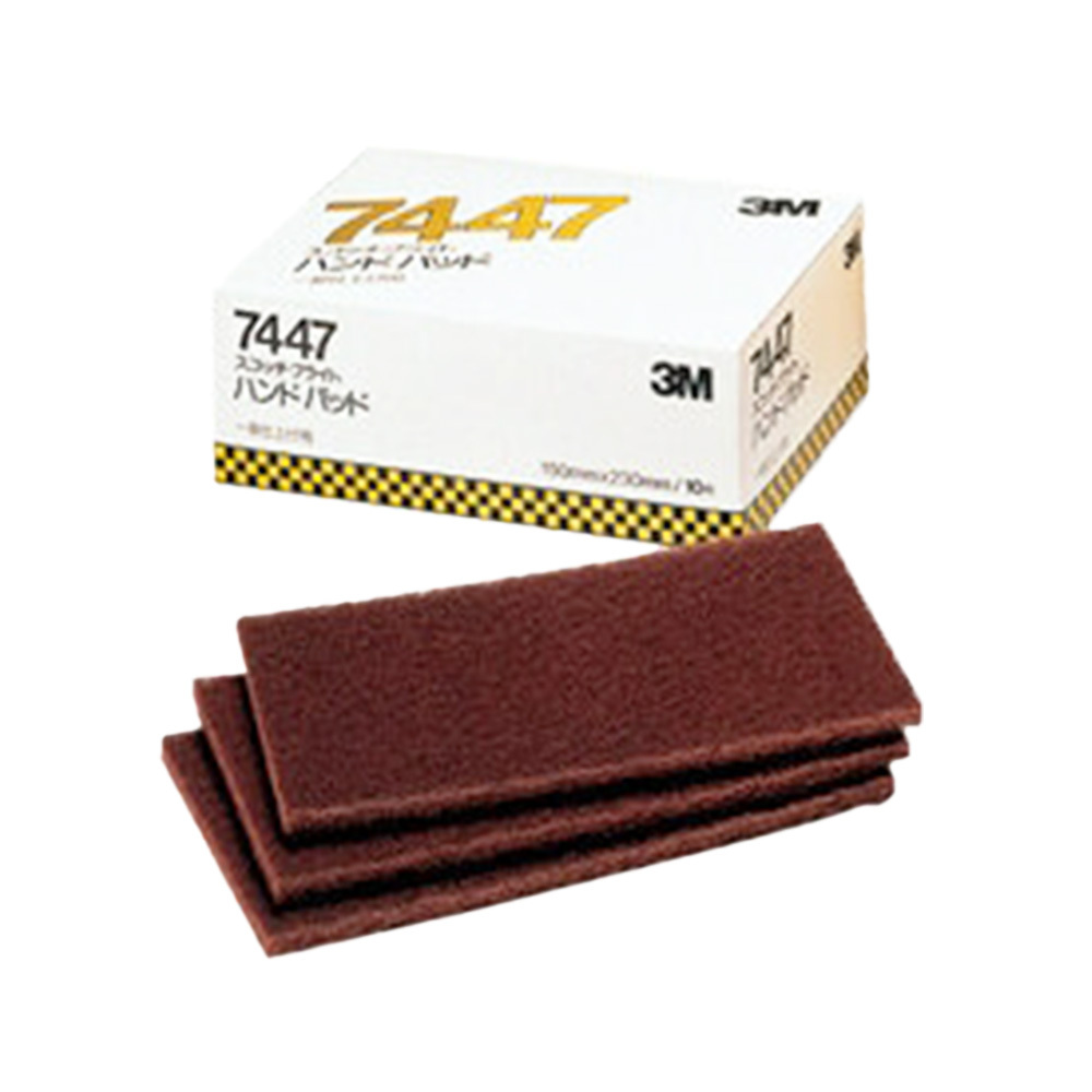 スコッチ・ブライト工業用パッド7447は、ナイロン不織布に研磨砥粒を塗布した、手作業用の表面処理材です。砥粒は酸化アルミニウムを使用し、グレードはVF(ベリーファイン 仕上げ粗さは#320相当)です。被研磨物を削りすぎることなく、凸凹に追従しながら仕上げることができます。標準的で幅広い用途に使用でき、サビ取り、汚れ取り、アルミの擦り傷ぼかし、塗装前の粗面化などに適しています。水・油との併用も可能です。予めミシン目が入っており、1/2サイズ、1/4サイズに手で切りやすくなっています。