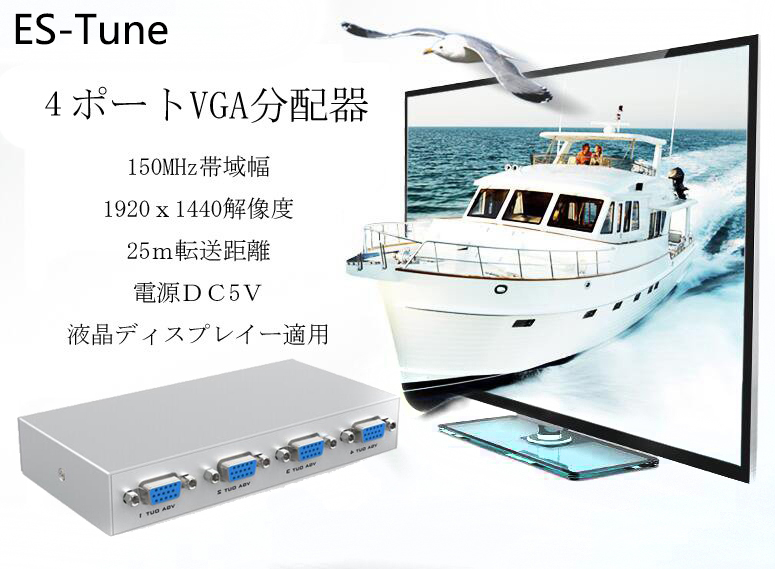 ES-Tune VGA分配器 ディスプレイスプリッタ 1入力4出力 伝送距離25M 1080P DDC機能サポート