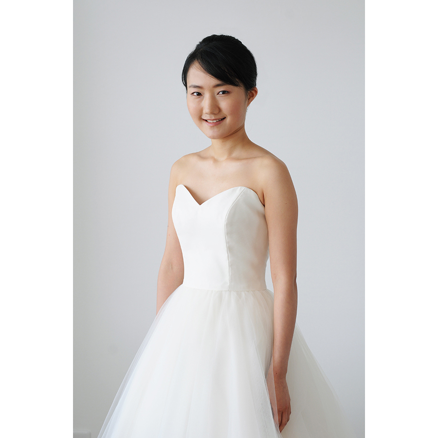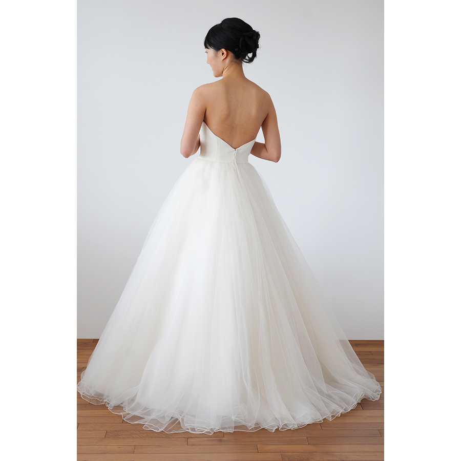 シンプルなデザイン、すっきりと程よくVに明いた背中、チュールとオーガンジーの軽やかなドレスです。