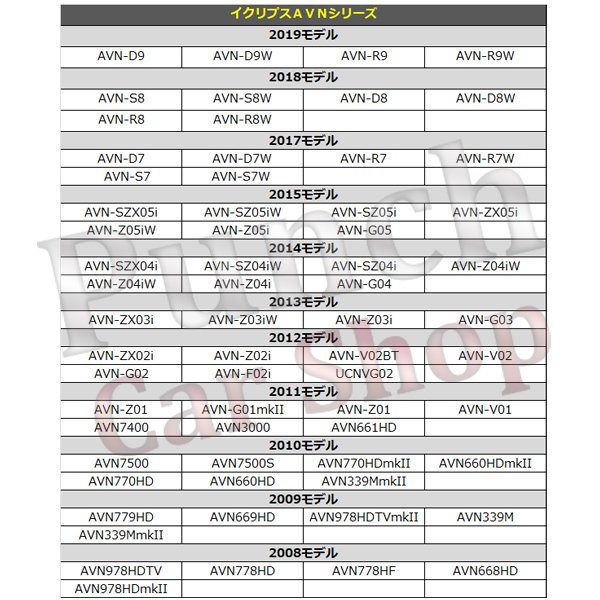 | 適合一覧 イクリプスAVNシリーズ 2019モデル AVN-D9 AVN-D9W AVN-R9 AVN-R9W 2018モデル AVN-S8 AVN-S8W AVN-D8 AVN-D8W AVN-R8 AVN-R8W 2017モデル AVN-D7 AVN-D7W AVN-R7 AVN-R7W AVN-S7 AVN-S7W 2015モデル AVN-SZX05i AVN-SZ05iW AVN-SZ05i AVN-ZX05i AVN-Z05iW AVN-Z05i AVN-G05 UCNVG05 2014モデル AVN-SZX04i AVN-SZ04iW AVN-SZ04i AVN-Z04iW AVN-Z04iW AVN-Z04i AVN-G04 2013モデル AVN-ZX03i AVN-Z03iW AVN-Z03i AVN-G03 2012モデル AVN-ZX02i AVN-Z02i AVN-V02BT AVN-V02 AVN-G02 AVN-F02i UCNVG02 2012モデル AVN-Z01 AVN-V01 AVN-G01mkII AVN-G01 AVN661HD AVN7400 2011モデル AVN-Z01 AVN-G01mkII AVN-Z01 AVN-V01 AVN7400 AVN3000 AVN661HD 2010モデル AVN7500 AVN7500S AVN770HDmkII AVN660HDmkII AVN770HD AVN660HD AVN339MmkII 2009モデル AVN779HD AVN978HDTVmkII AVN669HD AVN339M AVN339MmkII 2008モデル AVN978HDTV AVN778HD AVN778HF AVN668HD AVN978HDmkII トヨタ/ダイハツ純正ディーラーオプションナビ適合機種一覧 2018年モデル(W68シリーズ) NSZN-Z68T NSZN-Y68T NSZT-W68T NSZP-X68D NSZP-W68D 2016年モデル(W66シリーズ) NSZT-W66T NSZT-Y66T NSZN-Z66T 2014年モデル(W64シリーズ) NSZT-W64 NSZN-W64T NSZT-Y64T NSZT-YA4T NSZA-X64T 2013年モデル(W63シリーズ) NSZN-W63D 2012年モデル(W62シリーズ) NHBA-X62G NHZN-X62G NHBA-W62G NHZD-W62G NSZT-W62G NSLN-W62 2011年モデル(W61シリーズ) NHZA-W61G NHZN-W61G NSZT-W61G NHZN-X61G 2010年モデル(W60シリーズ) NSZD-W60 NSZT-W60 NHZA-W60G NHZN-W60G 2009年モデル(W59シリーズ) NHZN-W59G NHZA-W59G 2008年モデル(W58シリーズ) NHZT-W58 NHZT-W58G NHZA-W58G NHZP-W58S 備考 ※表に記載の機種以外の適合につきましては当方では解り兼ねます。 |