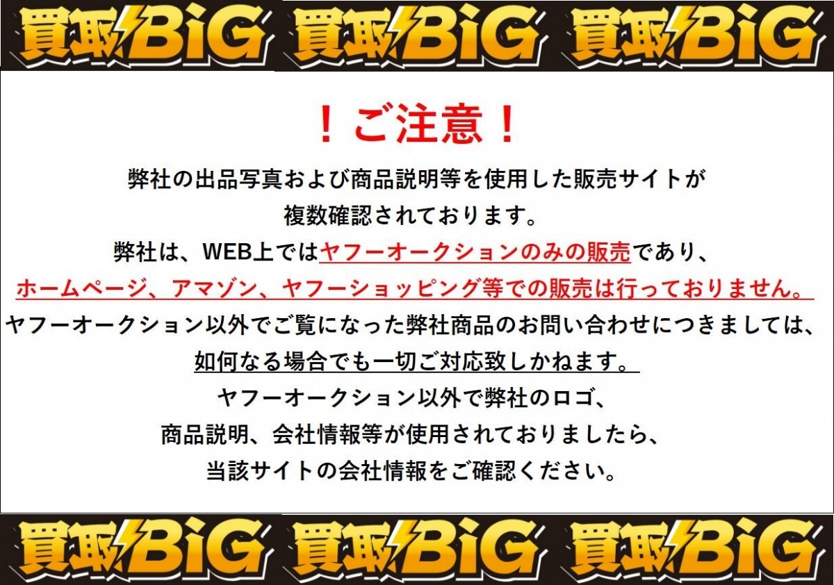 【領収書の発行】 ・インボイス対応です。 ・ご入金前に取引メッセージでご依頼ください。(宛名・但し書き明記) ・ご入金後の発行は原則承れません。 ・お客様都合による領収書のみの郵送、再発行は承れません。 【商品について】 ■ 中古品につき、現状渡しとなります。 状態確認・説明には万全を期しておりますが、見落としの可能性もございます。 ご理解のうえご入札をお願いいたします。 【ご入札に関して】 ■ 以下は対応不可となります。 ・営業時間外のご質問や入札取消 ・落札後のキャンセル・クレーム ■ 複数落札予定の際は事前にご連絡ください。 【落札後の対応】 ■ 営業日2日以内に落札者情報のご入力をお願いします。 期日を過ぎた場合、落札者都合でのキャンセルとなります。 ※営業時間後、店休日に落札された場合は、翌営業日にご連絡いたします。 【発送先について】 ■ 登録住所以外へ発送をご希望の場合は、 取引メッセージにて正確な送り先をご連絡ください。 ■ 送料確定後の配送方法と住所変更、発送後の宛名変更はできません。 【補償対応】 ■ 初期不良のご連絡は商品到着後7日以内にお願いいたします。 ※取置き期間も含みます。 ※補償期間内にお電話でご連絡いただければ返金・返品対応いたします。 ※1000円スタート売切商品は対象外です。 ※使用に伴う事故等の責任は負いかねます。 【ご注意】 ●実店舗でも販売しており、売約済みとなった場合は出品を取消すことがあります。 ●東海店・西尾倉庫店など異なる拠点間での「まとめて取引」「同梱」 および「別店舗への商品移動」は承っておりません。 ■ 当社は店頭およびでのみ販売しております。 出品情報を悪用した詐欺サイトにご注意ください。 |