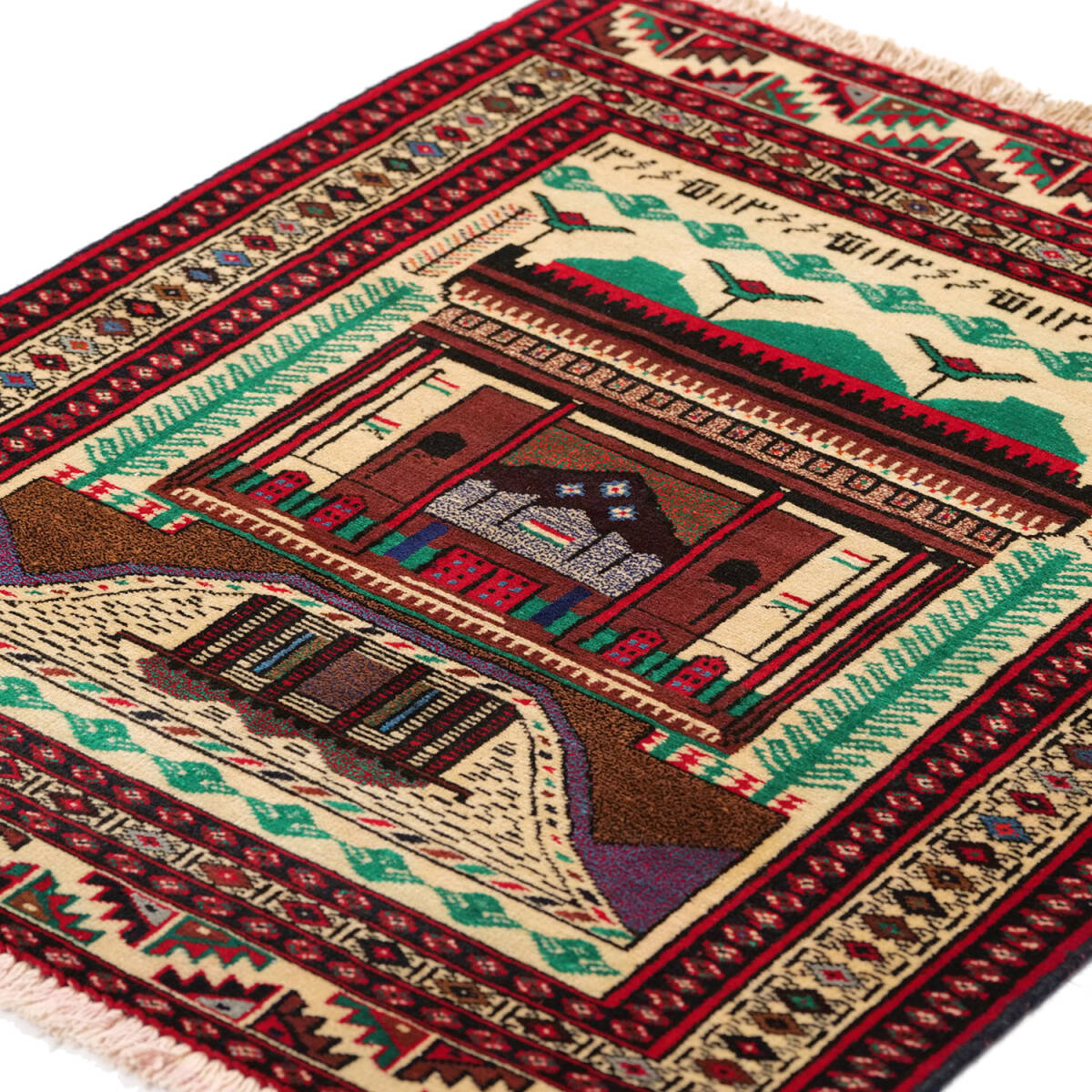 トルクメン地方で織られたマスジド文様の礼拝用ラグ。信仰を象徴するモチーフと伝統的な色使いが調和し、装飾的な美しさと精神的な深みを兼ね備えています。壁掛けとして飾っても印象的な一枚です。