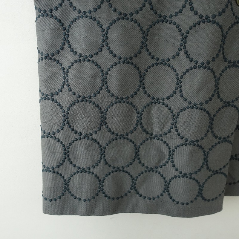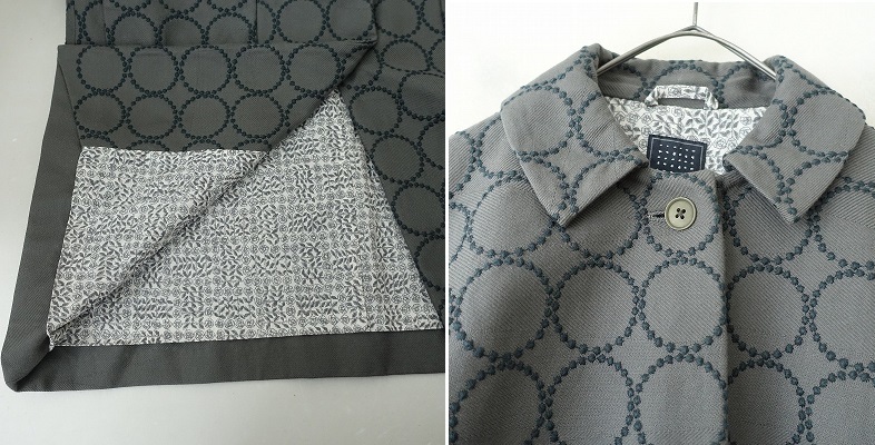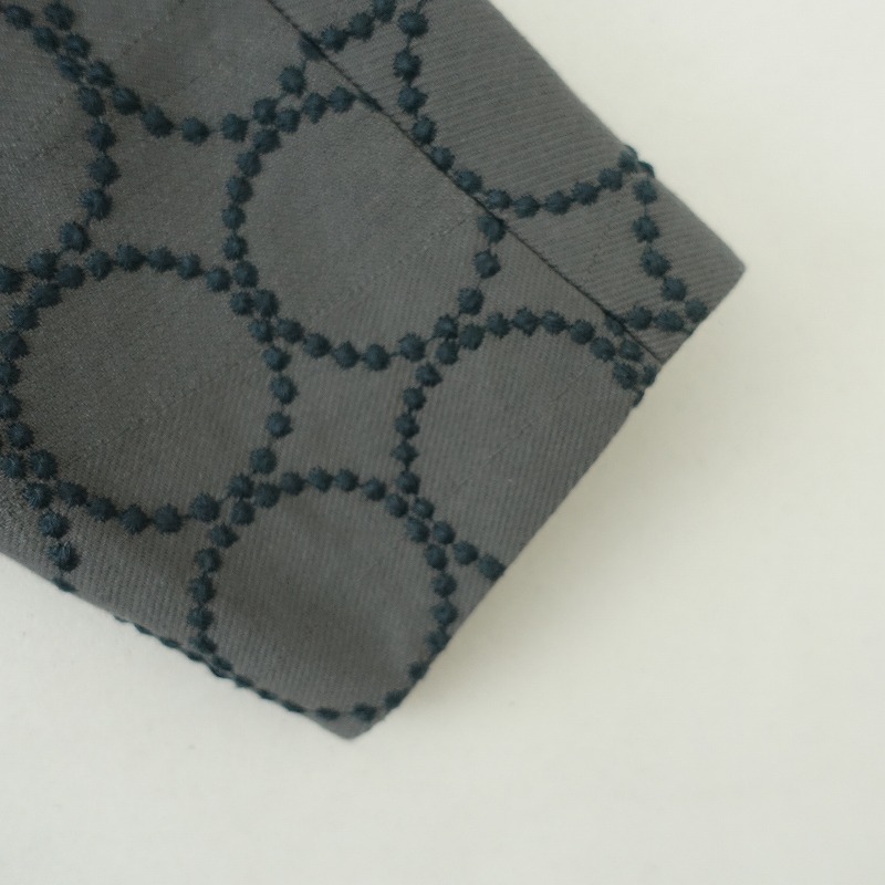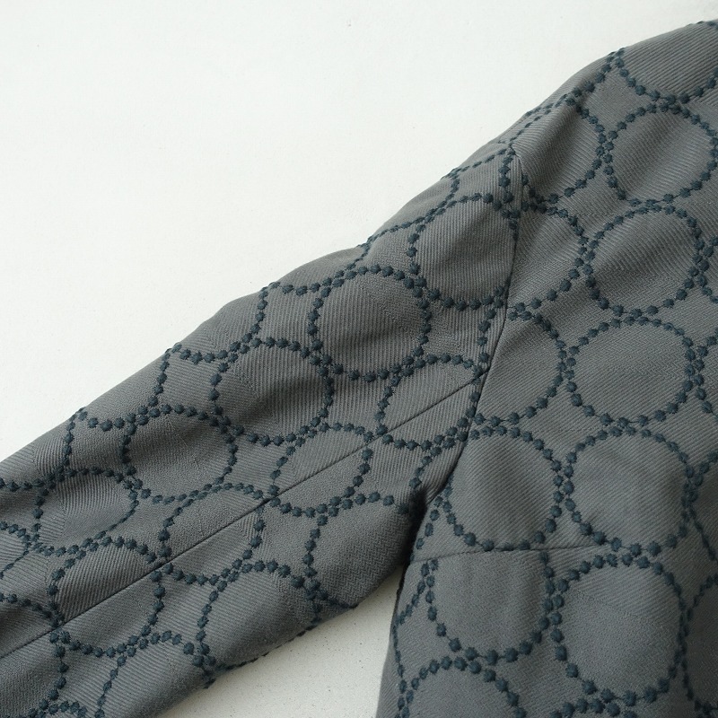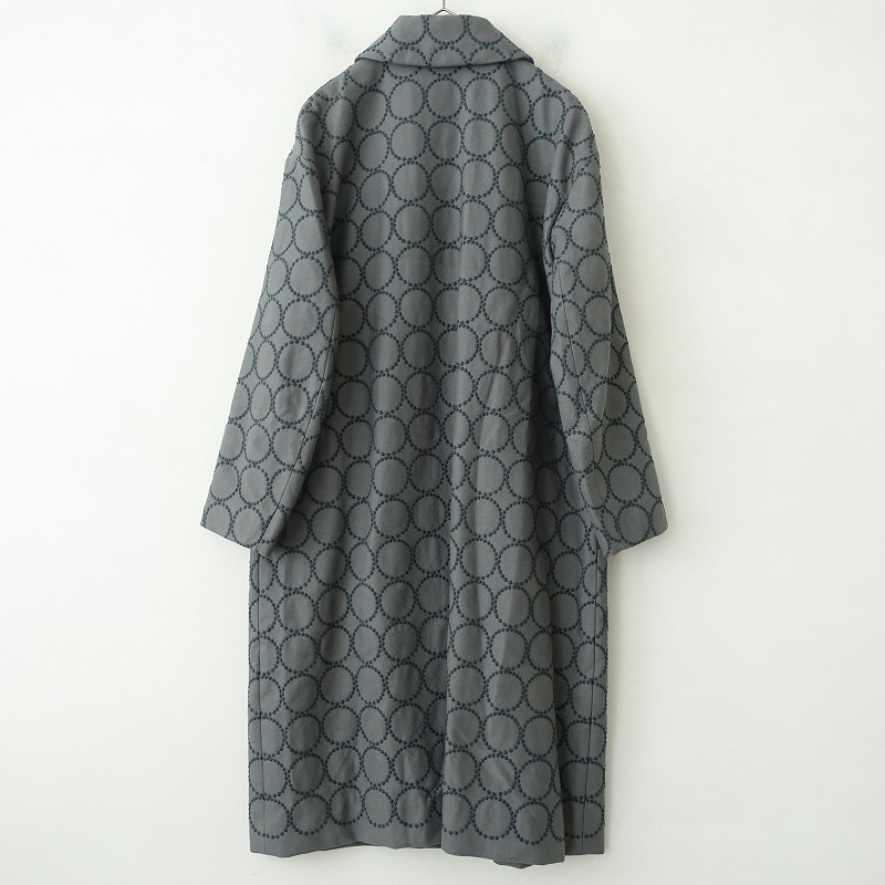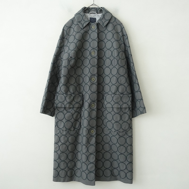 | mina perhonenのtambourine 刺しゅうコートです。カラーはグリーングレーの少し厚手素材ベースにグリーンのテキスタイル刺しゅうが全体にあしらわれております。フロントボタン開閉式のステンカラータイプで、フロント左右ウエストにスラップポケットがあり、「sleeping rose」のテキスタイルプリントが施された総裏地付きです。定価(メーカー希望小売価格)143000円の商品です。 |