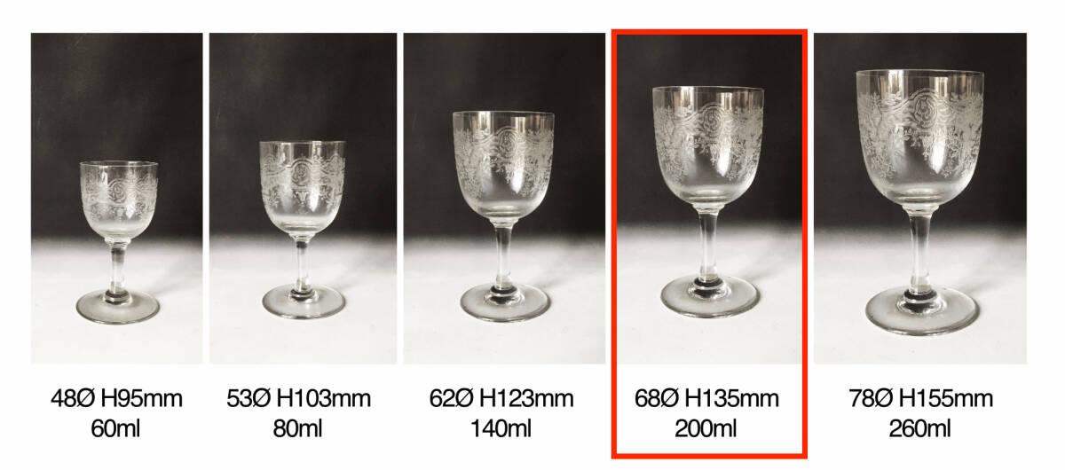 また、昔は小さかったワイングラスも現代的では重口赤ワインなどはこのくらいのサイズに半分以下注ぐのが主流いなっていますので、赤ワイングラスとしても十分お使いいただけます。