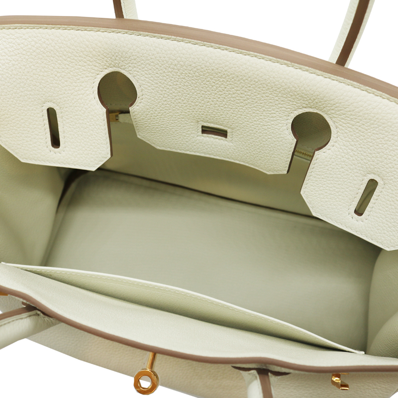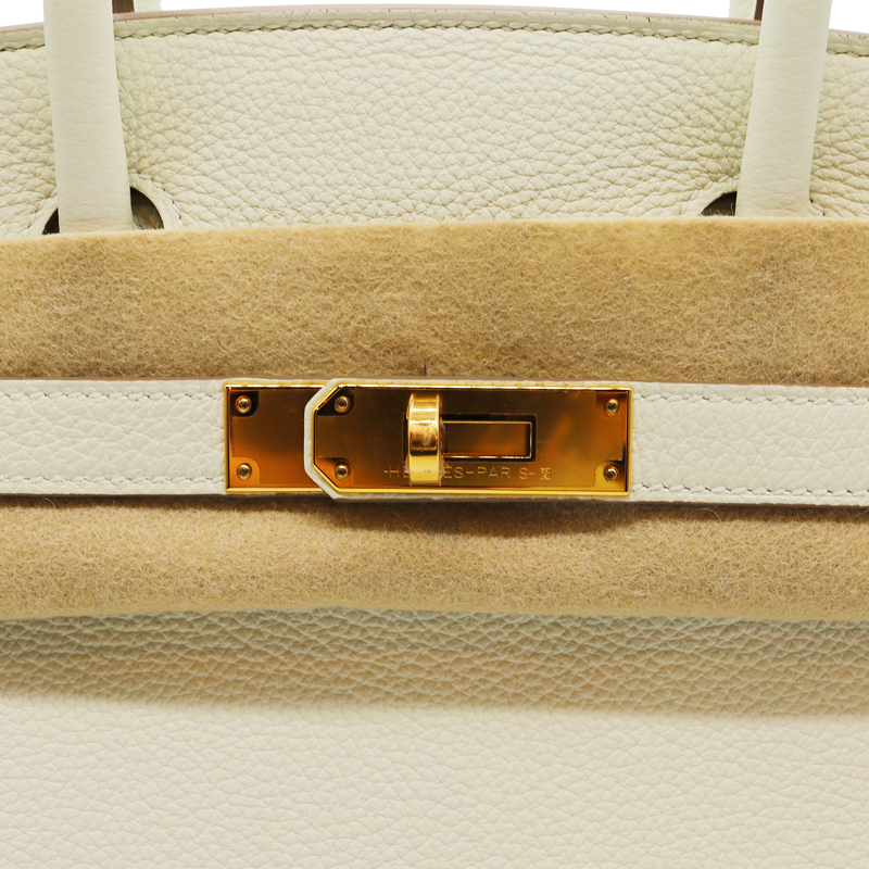 | エルメスを象徴する人気のバッグ「バーキン」30センチ。お色は新色の優しいホワイトカラーのマッシュルームカラーにゴールド金具が美しいデザインです。 | ||||||