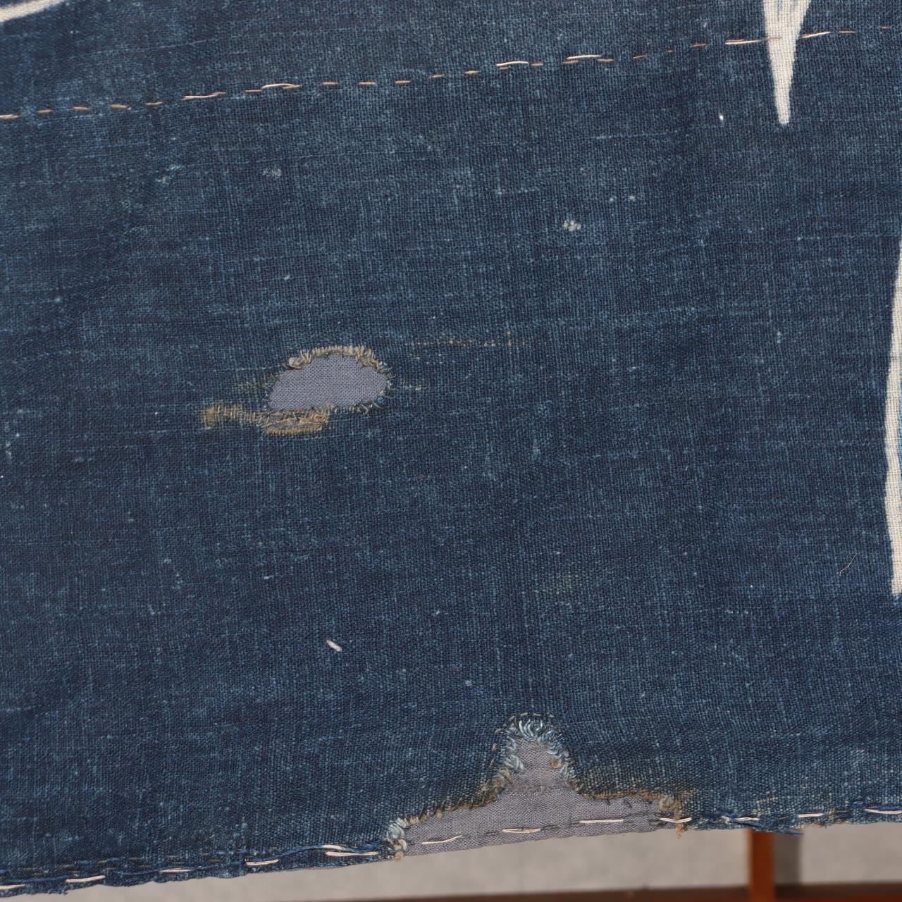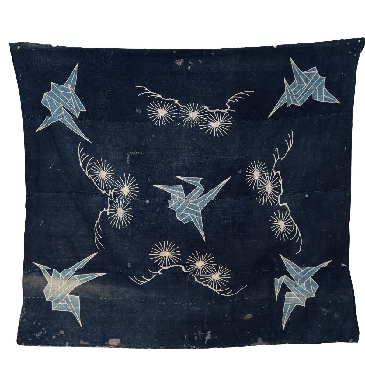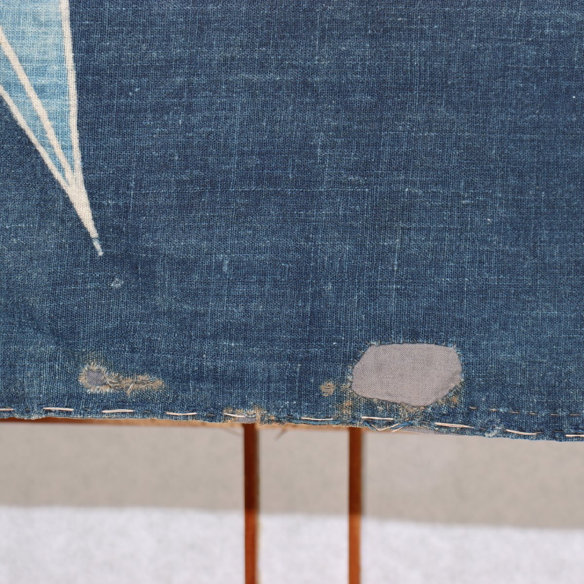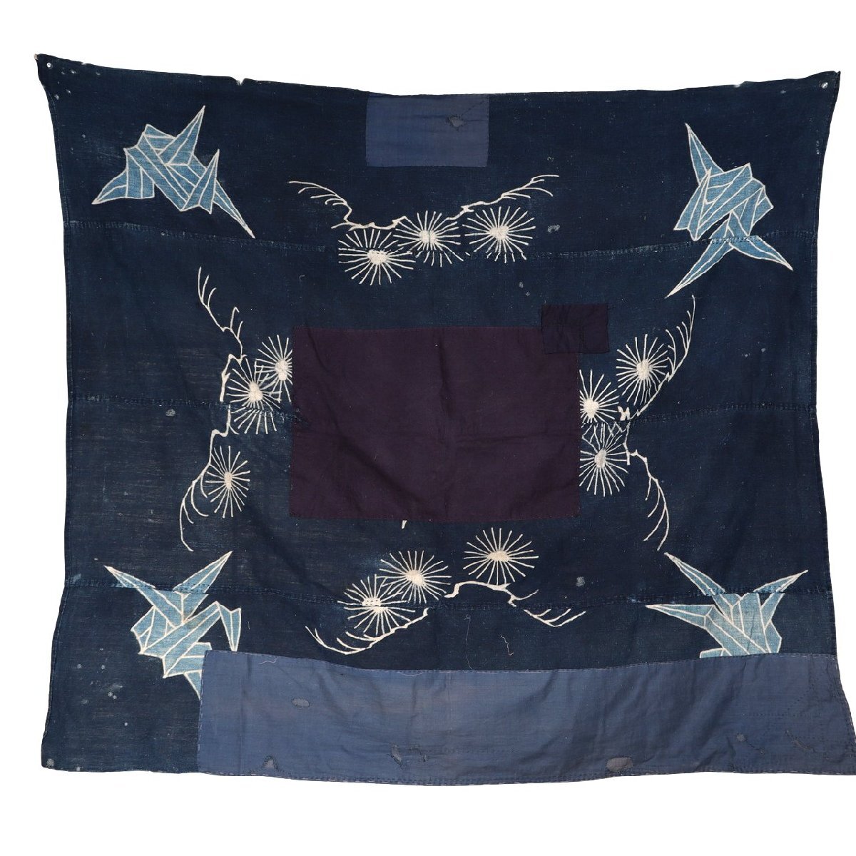 ◆ 商品説明こちらは日本の伝統的な藍染木綿布で、筒描技法による鶴と菊の意匠が描かれています。藍染の深い青に、淡い水色の鶴と放射状に広がる菊文様が施され、素朴ながら力強い民芸美が感じられる逸品です。 布地は長年の使用と補修を経て残されており、補修布が施されぼろの風合いを有しています。 【サイズ】 126cm × 136cm(約49.6 × 53.5インチ) 【状態】 裂け・補修跡・色褪せ・シミがございます。 当方は骨董品を中心に取り扱っており、安心してお取引いただけるよう丁寧な対応・梱包を心がけております。 ◆ 商品について