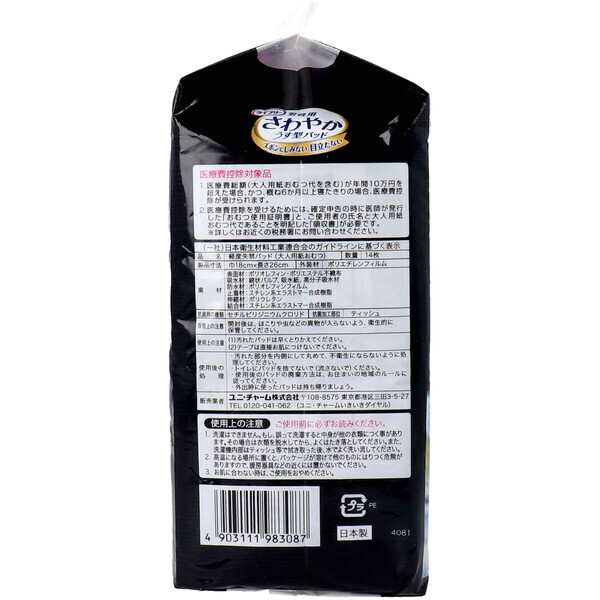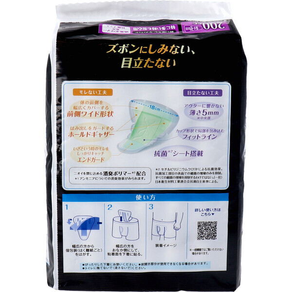 ズボンにしみない、目立たない! モレを防ぐ&目立たない工夫がつまった、男性のための尿ケア専用品です! 下着につけるタイプ! <モレない工夫> ・体の前側を幅広くカバーする前側ワイド形状 ・はみ出しをガードするホールドギャザー <目立たない工夫> ・アウターに響かない薄さ5mm(※中央部) ・カップ形状で局部を包み込むフィットライン ・抗菌シート搭載 ・ニオイを閉じ込める消臭ポリマー配合 ※アンモニアについての消臭効果が見られます 個装サイズ:135X165X90mm 個装重量:約270g 内容量:14枚 製造国:日本 【発売元:ユニ・チャーム】 【医療費控除対象品】 (1)医療費総額(大人用紙おむつ代を含む)が年間10万円を超えた場合、医療費控除が受けられます (2)医療費控除を受けるためには、確定申告時に医師が発行した「おむつ使用証明書」と、ご使用者の氏名と大人用紙おむつ代であることを明記した「領収書」が必要です。 ※傷病によりおおむね6か月以上寝たきりで医師の治療を受け、おむつを使う必要があると認められた場合に限ります ※詳しくはお近くの税務署にお問合せください。 【製品寸法】 巾18cm×長さ26cm (特に多い時も安心用:200cc) 【素材】 ・表面材:ポリオレフィン・ポリエステル不織布 ・吸収材:綿状パルプ、吸水紙、高分子吸収材 ・防水材:ポリオレフィンフィルム ・止着材:スチレン系エラストマー合成樹脂 ・伸縮剤:ポリウレタン ・結合材:スチレン系エラストマー合成樹脂 【使用上の注意】 ・洗濯はできません もし、誤って洗濯すると中身が他の衣類につく事があります その場合は衣類を脱水してから、よくはたき落してください また、洗濯機内部はティッシュ等で拭き取った後、水でよく洗い流してください。 ・高温になる場所に置くと、パッケージが溶けて他のものにはりつく危険がありますので、暖房器具などの近くには置かないでください。 ・お肌に合わない時は、ご使用をお止めください。 ・汚れたパッドは早くとりかえてください。 ・テープは直接お肌につけないでください。 【保管上の注意】 ・開封後は、ほこりや虫が入らないよう、衛生的に管理してください。 【使用後の処理】 ・汚れた部分を内側にして丸め、不衛生にならないように処理してください。 ・トイレにパッドを捨てないで(流さないで)ください。 ・使用後のパッドの破棄方法は、お住まいの地域のルールに従ってください。 ・外出時に使ったパッドは持ち帰りましょう。 注意事項 予告なく成分・パッケージが変更になることがございます 予めご了承ください。 *予告なく成分・パッケージが変更になることがございます。予めご了承ください *ダンボールを使用して発送する場合には、入数以下の個数の場合、 中古ダンボールを使用する場合があり、ご注文の商品とは異なるダンボールになる場合があります。 あらかじめ、ご了承ください。 |