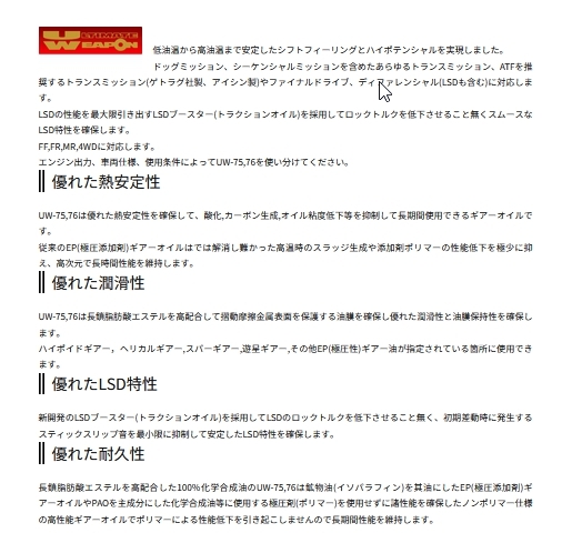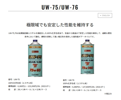 極限域でも安定した性能を維持する高性能ギアオイル! ■メーカー: NUTEC (ニューテック) ■シリーズ: ギヤオイル Ultimate Weapon ■商 品 名: UW-76 ■ベースオイル: 100%化学合成(エステル系) ■粘度: 75w140 ■容量/荷姿 : 20LX1本 ■品番 : UW76-20-1 ■メーカーホームページ ※写真はイメージ画像となります。 ※実際の商品はタイトル記載の容量となります。 ※容量ごとに容器の形状は変わります。 |