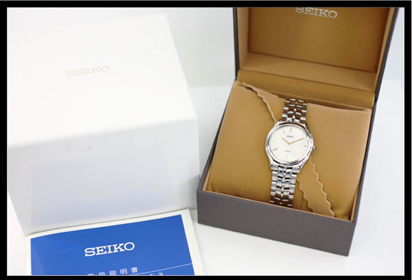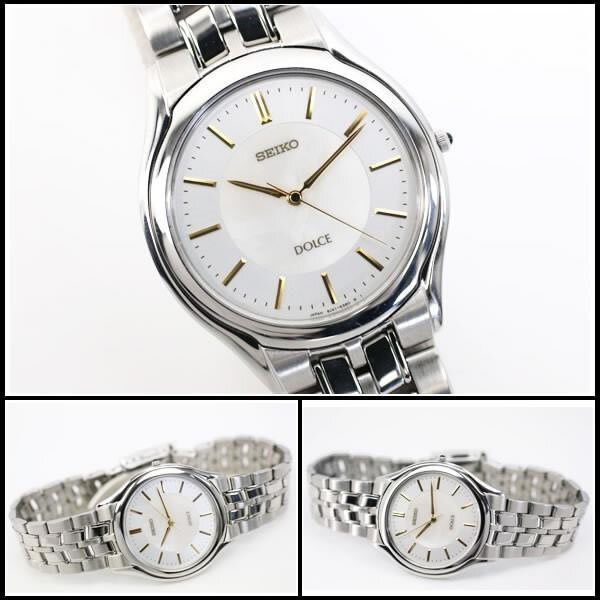 | その他商品説明 | 国産時計メーカーとして長い歴史と信頼あるセイコーから、シルバーボディにホワイトシェルの色合いが大変美しい「ドルチェ」をご紹介します。当商品はセイコー社を代表する人気の「ドルチェ」クオーツモデルであり、「大人のためのドレスウォッチ」のコンセプトに基づきデザインされた薄型のケースとブレスレットが絶妙にマッチしています。また、ダイヤル中央には角度によって色合いが美しく変化するホワイトシェルが採用されており、ゴールドカラーのバーインデックスと共にさり気ない高級感を演出しています。どんなファッションとも相性が良く、スーツからカジュアルまで幅広くマッチします。この機会に是非ご検討下さい。 状態:当商品は未使用の保管品なので大変美品です。専用箱・取説等の付属品があります。未使用・保管品につき自信を持ってお勧めします。 |