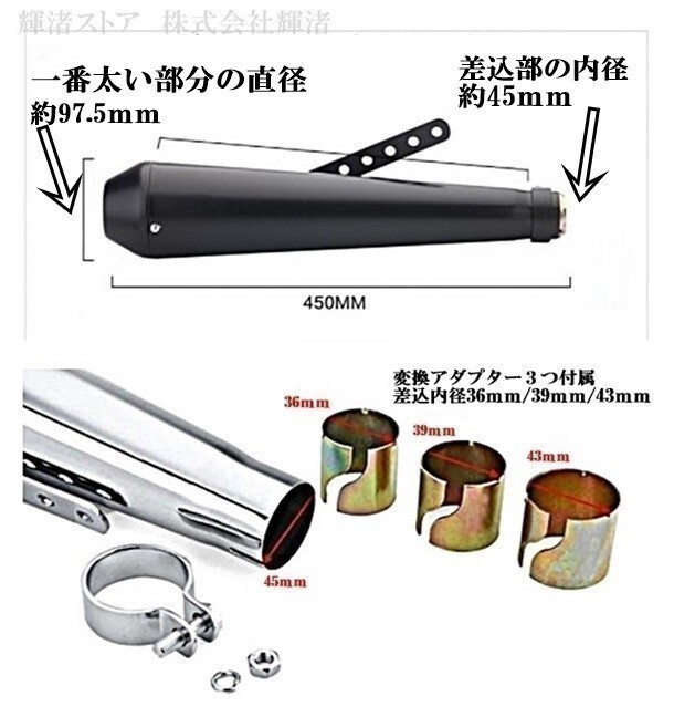 | 商品説明 | ご覧いただきありがとうございます。 【発送方法】 日本郵便ゆうパック(提携版) (1-2営業日以内に奈良県から出荷致します。) 【カラー】 メッキ 【内容】 スリップオンマフラー本体×1本 固定リング ボルト、ナット、ステー 変換アダプタ( 約36mm/約39mm/約43mm)※割が入っているため約表示 ※別ページにて2本セットを出品しております。 【材質】 製品の材質:鉄(スチール) 製品重量:1914g (スリップオンマフラー+付属品すべてを一括計量時) 商品側の差込口内径が 約45mmです。 【備考】 中に脱着不能のパンチングサイレンサーが入っております。 更に音量を落とされる場合には、 干渉しないサイズのインナーバッフルをご用意いただき 穴あけ 取付加工が必要です。 【梱包】 また他の販売先よりも安く販売させていただいており、 再利用段ボールにて梱包となる場合がございます。 【適合判断および取付加工について】 差込径が45mm以下であれば、基本的には装着が可能ですが 実車を確認しないとわからないため、回答できません。 ご自身で適合するかが分からない場合は、 バイクショップなどの専門業者にご相談を推奨します。 汎用品のため、付属のステーのまま装着できないケースもあり また、差込口から排気漏れをしないように加工が必要なケースもあります。 ■商品についての詳細仕様書・説明書は付属しておりません。 ■輸入品のため使用に支障の無い小スレ・小キズなどある場合がございます。 ■入荷ロットにより仕様変更がある場合がございます。大きな変更があった場合は商品画像を変更致します。 ■車両名の記載が有る場合でも、汎用品ですので車種により取付可否と取付時の加工内容が異なります。 ■ご購入前に現車の形状確認をお願い致します。 ■社外の汎用部品につき、多少の加工を要する場合がございます。 ■作業などショップ様にご依頼する場合は |