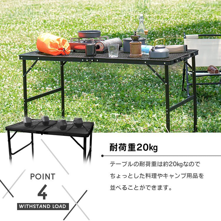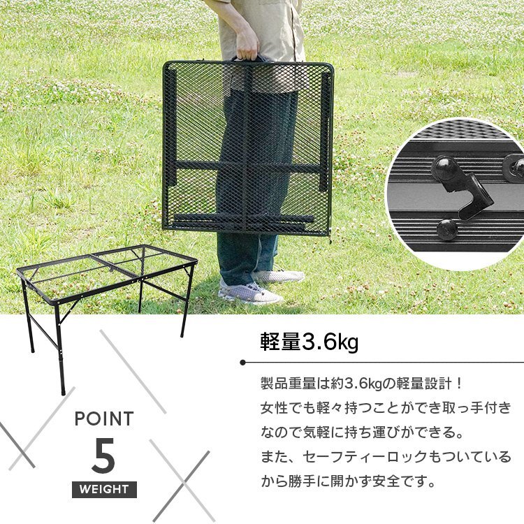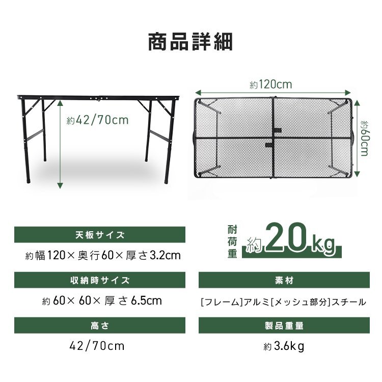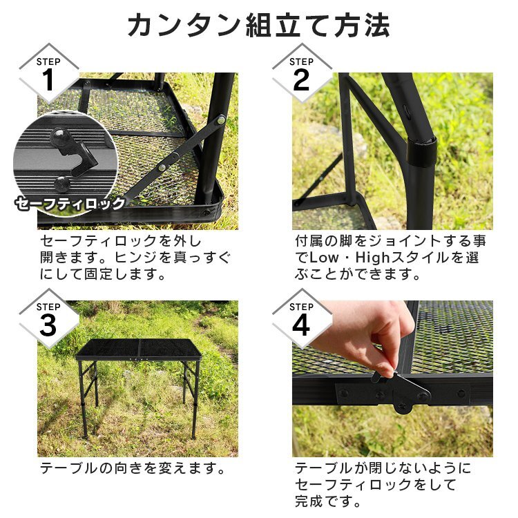 丈夫で軽いスチール製テーブルです! 耐熱温度180℃なので、熱い鉄板やスキレットをそのまま置けます!! 汎用性が高い幅120cmサイズです。 使わない時は折り畳んでコンパクト!持ち運びしやすい!! テーブル高さは2段階調整可能! 用途に合わせてロースタイル、ハイスタイルと使い分けできます。 簡単に組立可能! 女性でも気軽に使えます♪ ■商品コード:A61MS004 ■商品仕様 カラー:ブラック 使用時:(約)幅120cm×奥行60cm×高さ42/70cm(2段階調整可能) 収納時:(約)幅60cm×60cm×厚さ6.5cm 重量:(約)3.6kg 耐荷重:(約)20kg 材質:スチール、アルミ その他:折りたたみ、耐熱温度180℃ ■注意事項 ・海外製品で簡易梱包での輸入のため風防に擦れや多少の小キズなどがある場合がございますが、 商品自体には問題ありませんのでご了承下さい。 ・商品は、モニターによって色合いが異なって見える場合があります。 ・仕様・デザインは改良のため予告なく変更することがあります。 ■保障期間 7日間 ※商品到着後7日以内の初期不良・破損のみご対応させていただきます。 【新品未使用品です】 |