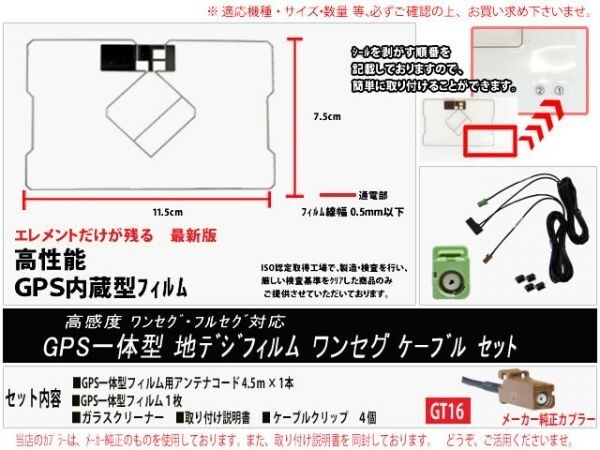 DG8CA カロッツェリア純正ナビ 楽ナビ サイバーナビ GT16カプラ GPS一体型汎用地デジアンテナコード&フィルムセット 当店をご来店頂き、誠にありがとうございます。 【セット内容】 GT16 カプラ カロッツェリアGPSアンテナ 一体型用アンテナコード(ブースター付、粘着テープ付属) 1本 スクエア型 GPS一体型フィルムアンテナ 1枚 取り付け案内説明書 1部 ガラスクリーナー 1枚 商品は上記セットでの販売となります。 カプラー形状 GT16ワンセグ/フルセグ対応 地デジ用汎用フィルム&ケーブル のセットです。 GPSが地デジアンテナと一体型のフィルムアンテナになっております。 汎用品となりますが、メーカーの純正カプラーを使用しておりますので、ご安心ください。 車のお乗り換え・カーナビの買い替え、乗せ替え、ガラスの交換時にとっても便利な汎用のアンテナセットです。 ※フルセグ(4CH)をご希望の場合ご相談ください。 エレメント保護フィルムの面積を最小限に抑えた、高感度なフィルムアンテナです。 剥がす際、番号を降っておりますので簡単に取り付けできます。メーカー純正品同等の感度を実現しました。 こちらの商品は、1チューナーのご用意となっております。フルセグ(4CH)等に取り付けをお考えの方は、他出品しておりますので、ご相談ください。 適合は、適合表に記載しております カロッツェリア等用 となっております。 適合に関してわからないこと等ありましたら、質問欄にてご連絡ください。可能な限りでのお答えをさせて頂きます。 ※電波の受信感度を向上させるものではございません。 ※必ず掲載写真でのカプラー形状の確認をお願いいたします。 ※電波を通しにくいガラスやフィルムを貼り付けたガラスでは、受信感度が低下する場合がございます。 ※取り付けミスによる商品の保証はいたしておりません。