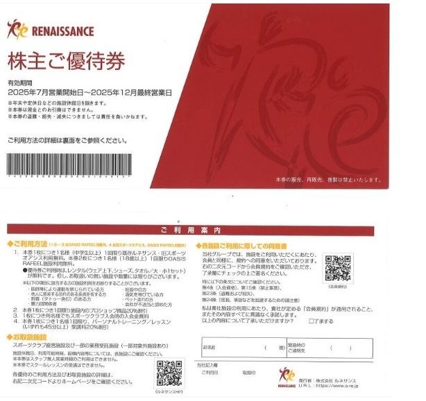 ルネサンス 株主優待券1枚 ルネサンス施設利用他| 出价者 | 信用 | 价格 | 时间 |
