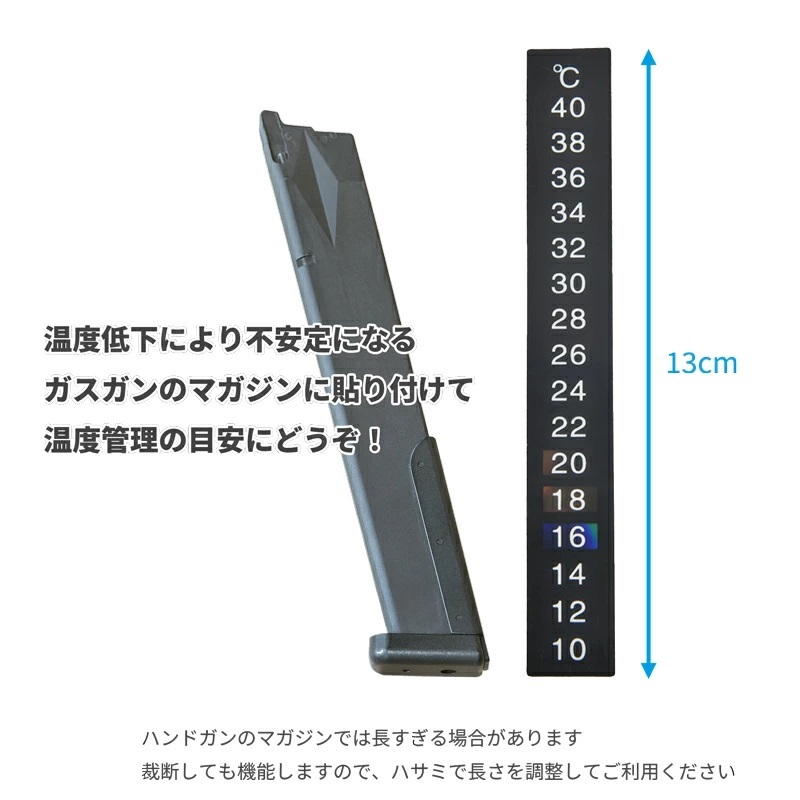 ●炎天下の車内温度や、冬場や発射による温度低下で不安定になるガスガン用マガジン温度、また、水槽の様なおおよその温度がパッと見でわかります。摂氏10~40度を℃で表示します。