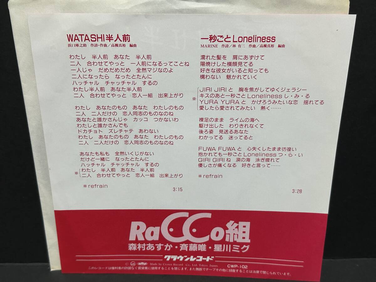 【中古シングルレコード】RACCO組■WATASHI半人前/一秒ごとLONELINESS■白ラベル■森村あすか・斉藤唯・星川ミグ | |||
