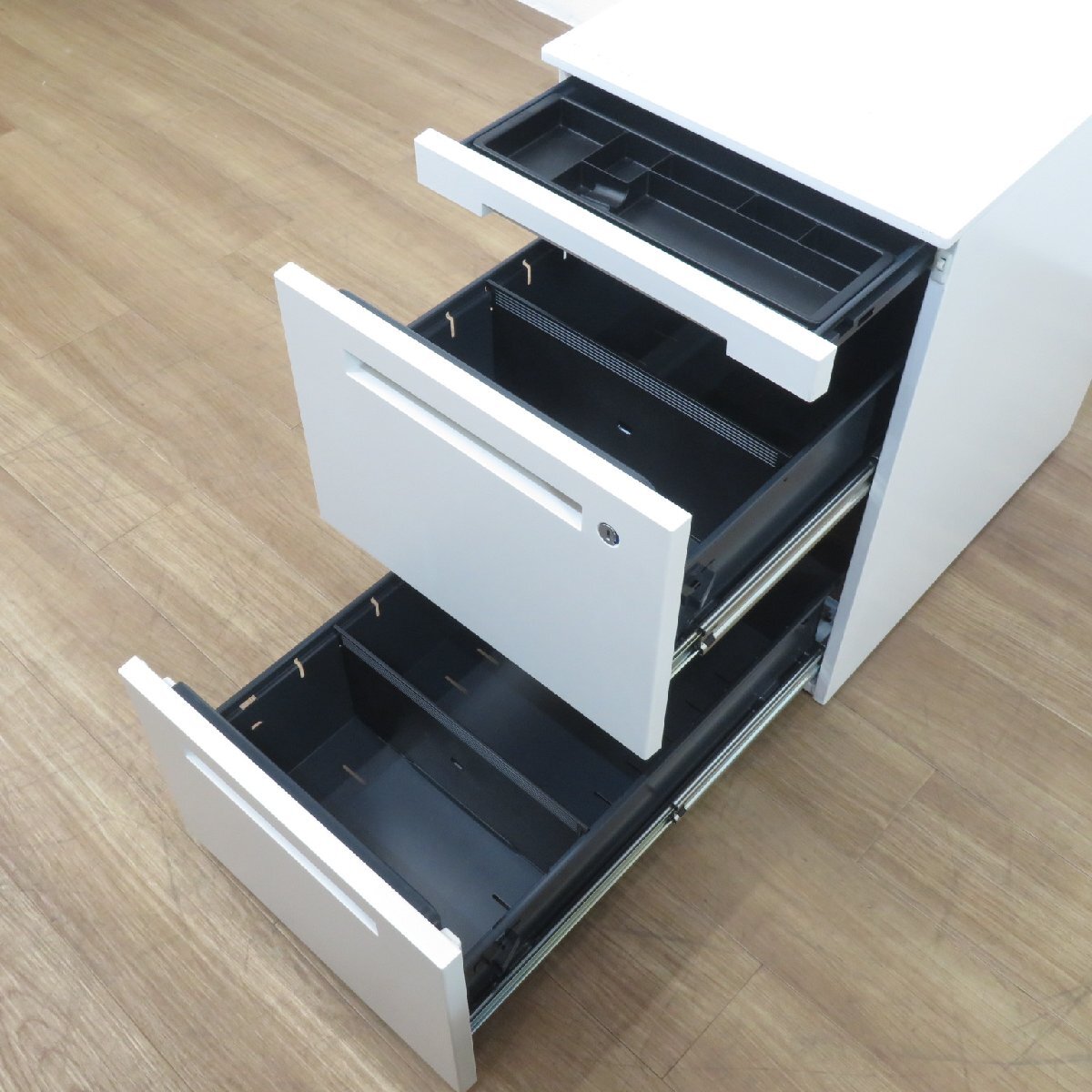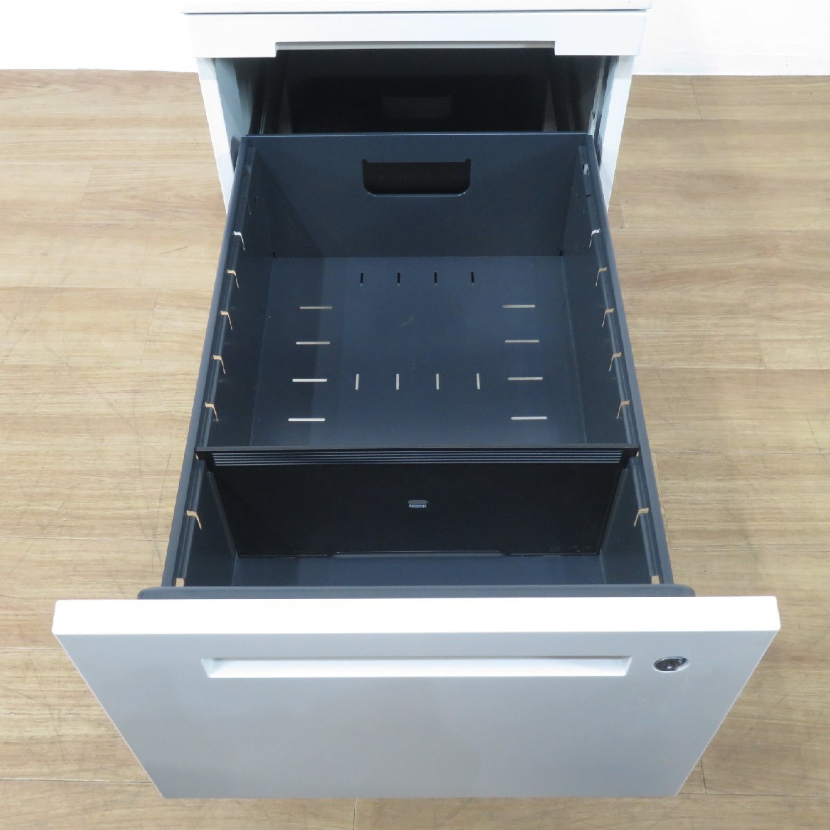 ムダを省いた、シンプルで研ぎ澄まされたデザインのオフィスデスク「CZR」シリーズ。 デスク下に置いたり、サイドに置いたりと自由な使い方が可能なワゴン。 上段には事務小物の整理に便利なペントレー付き。 下段には使用頻度の高い、A4サイズのファイルボックスが収納可能です。 ※写真で掲載の商品そのものが届くとは限りません。複数入荷した中の1点を掲載している場合がございます。 |
