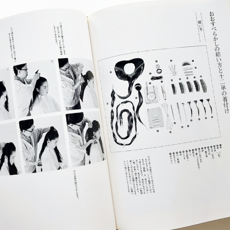 結髪工程写真の項では、先笄(江戸時代後期)と、おおすべらかしの結い方と、十二単の着付に的を絞り、