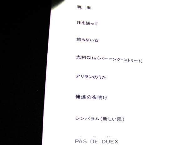 | 収録曲:現実/体を張って/飾らない女/光州City(バーニング・ストリート)/アリランのうた/俺達の夜明け | ||