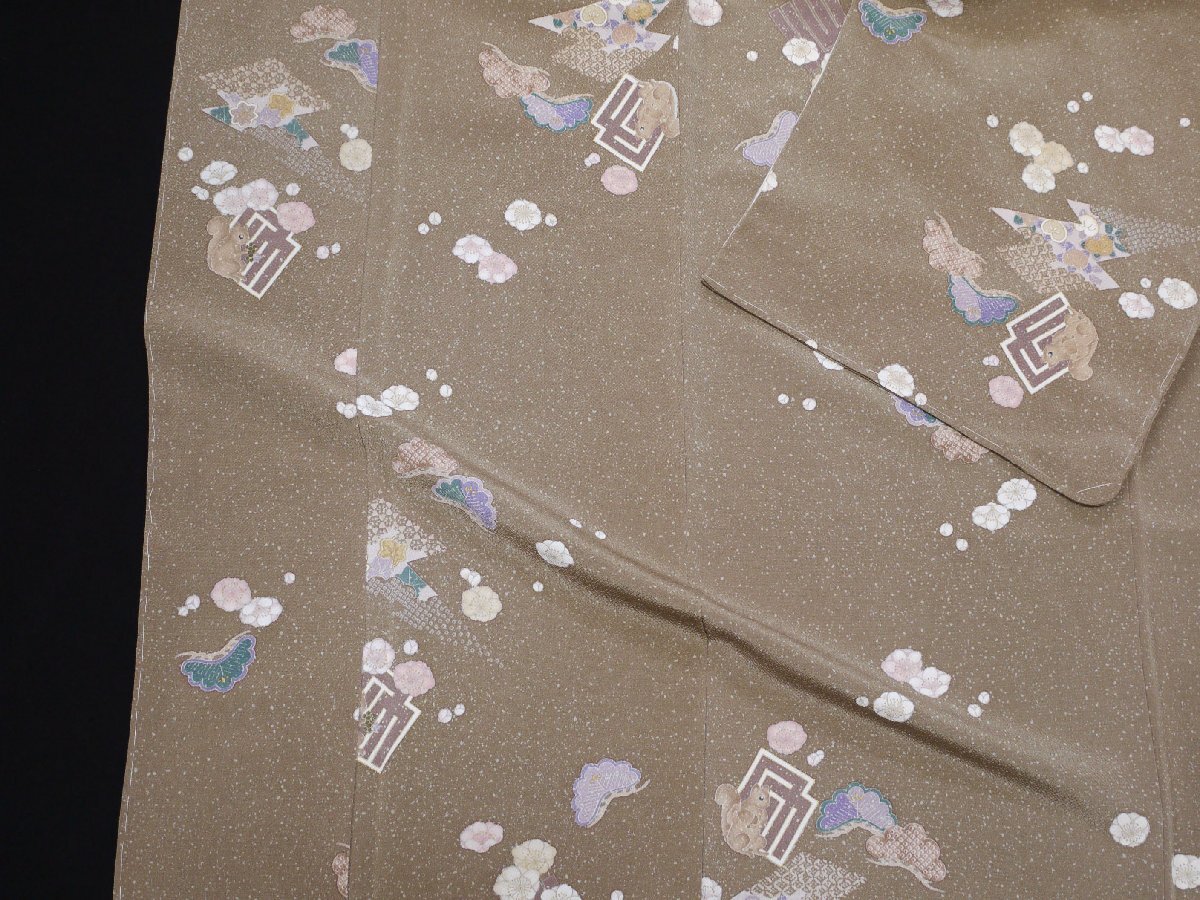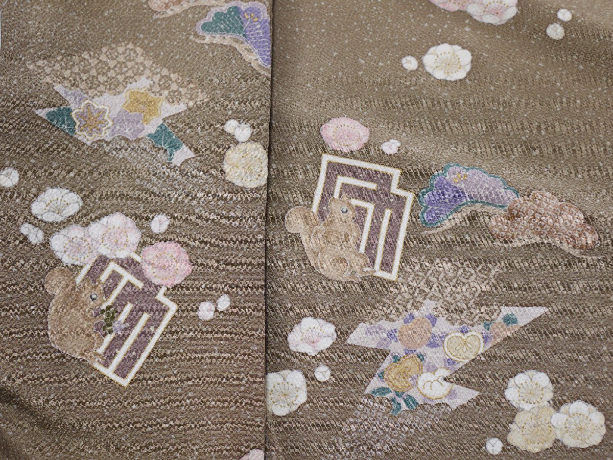 | 商品名 | 小紋 縮緬;薄茶色地 リスと源氏香 松 梅 四季の花入り松皮菱 |