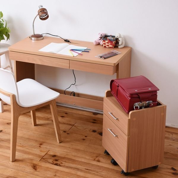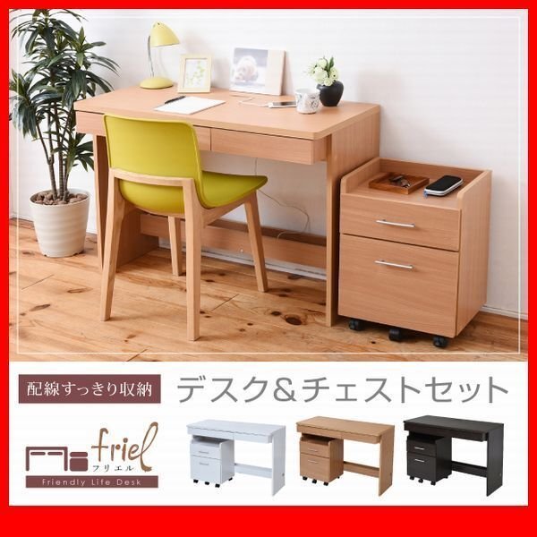 | シンプルなデスクにチェストが付いたセットアイテム。 デスクの足元には配線が収納できるスペースがあり、パソコンなどの充電コードが邪魔になりません。 幅100cm、奥行45cmのコンパクトなデザインは、 書斎でもリビングでも置き場所に困らずご使用いただけます。 |