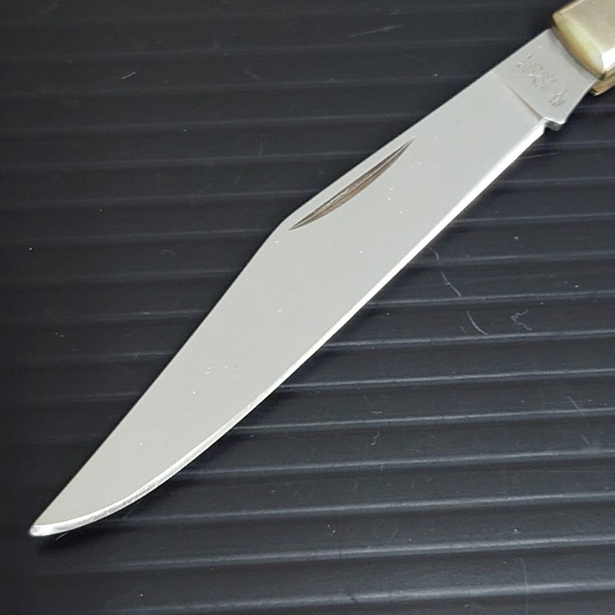 ※サイズ等詳細は 【↓もっと見る↓】をクリック! ブレードは写真では 白っぽく写っていますが 綺麗なミラーフィニッシュです 周囲風景が映り込んでいる場合が 御座いますが 大きな傷等では有りませんので 念の為 新品同様品ですが 一個人の自宅保管品ですので 写真で良く確認して頂き ご理解の上ご入札ください。 撮影上開閉はしています ■開時全長:約188mm ■収納時長:約105mm ■ブレード長:約75mm(実刃長) ■最大刃幅:約14mm ■最大峰厚:約2.4mm ■刃材:440C ■ハンドル材:オリーブ ハンドル ハンドルニッケルシルバー口金 ■付属:ポーチ |