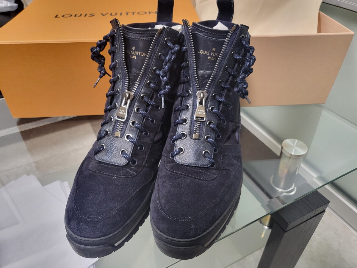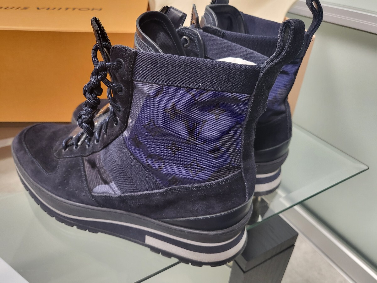 ネイビーのスエードとナイロン素材で、ジッパー付きのハイカットスニーカー。