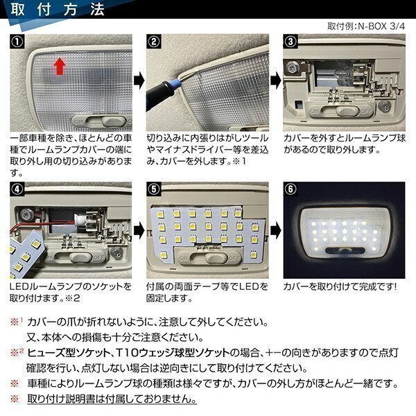 | 製品内容 | SMD ・フロントマップランプ:3chipSMD 14連×2 ・センターランプ:3chipSMD 30連×1 ・ラゲッジランプ:3chipSMD 2連×2 ・カーテシランプ(ドア):3chipSMD 2連×2 ・リア パーソナルランプ:3chipSMD 2連×1 ★サービス品★ ・T10ウェッジ球 ホワイト×2個 ホワイト スモールランプやナンバー灯等に使用可能です。 |