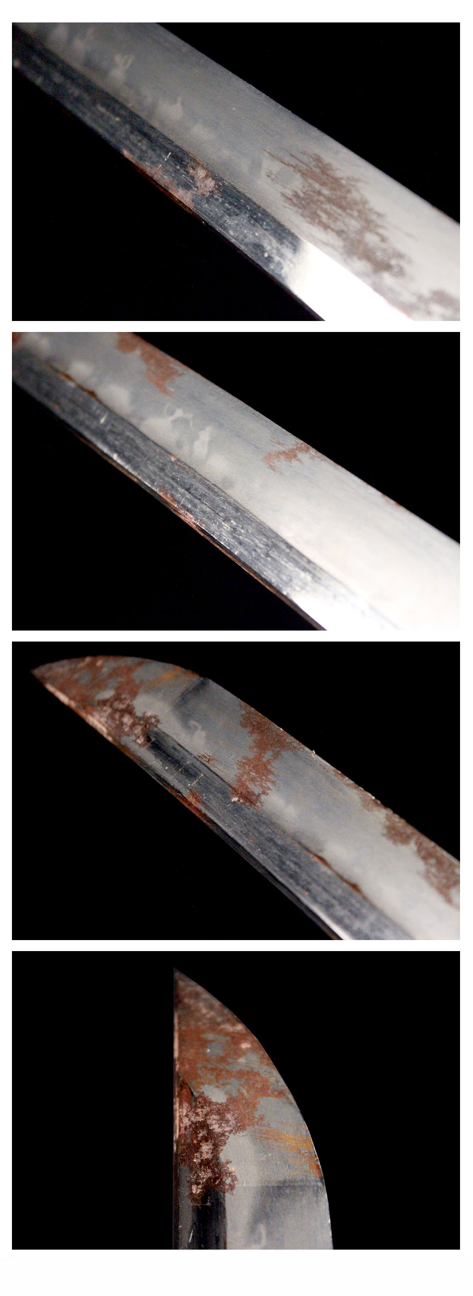 刀身長:約70.4cm 反り:約1.9cm 目くぎ穴:1個 元幅:約32.7mm 元重:約6.9mm 先幅:約22.8mm 先重:約5.2mm 刀身重:約761g 棟:庵棟 ハバキ:銅 |