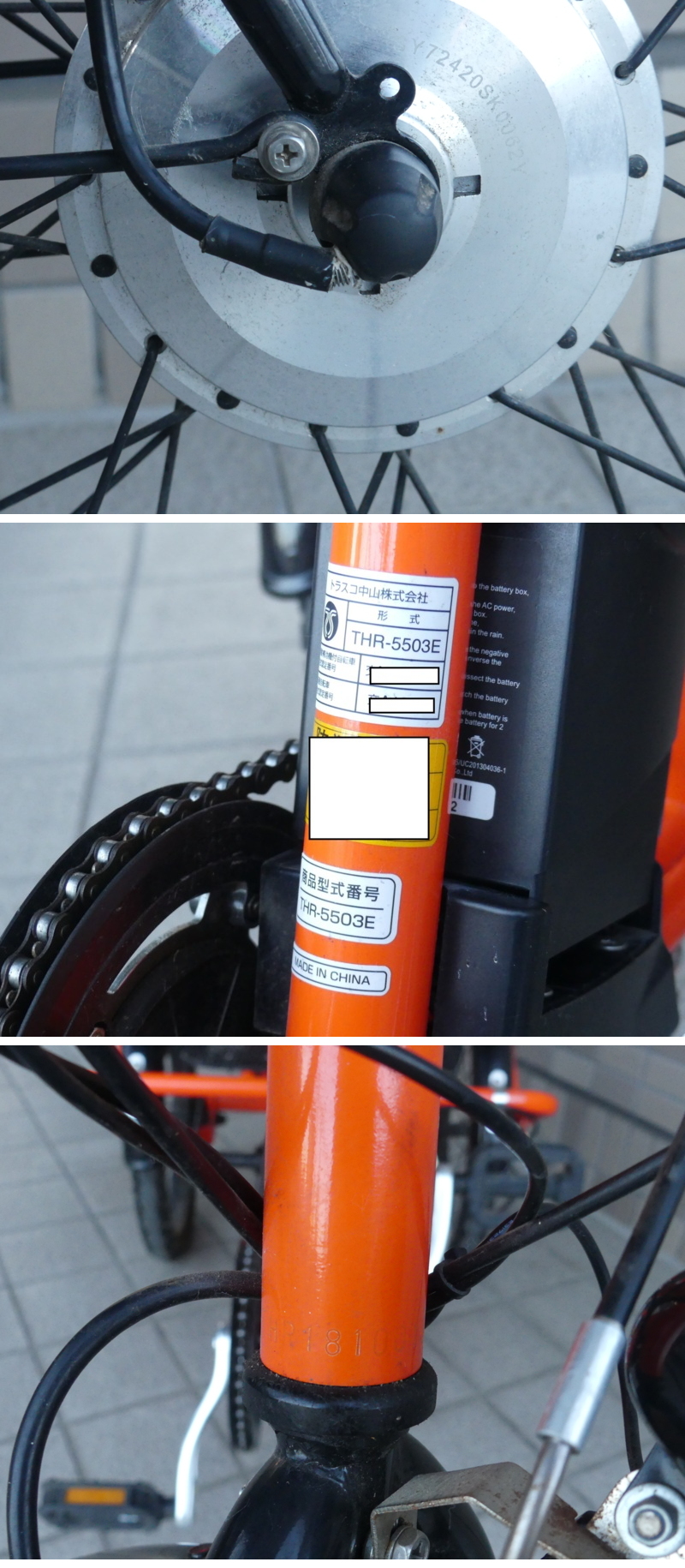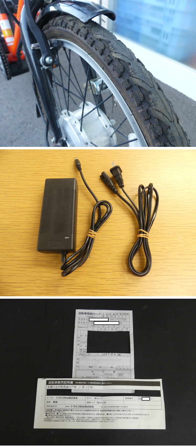 | ◇商品情報◇ | 当店の商品をご覧いただきありがとうございます!! トラスコ 電動アシスト ノーパンク 三輪自転車 ハザードランナー トライアシスト THR-5503E 走行動作確認済 乗用品の為、被膜の破れ、テープ補強、傷、擦れ、汚れ、小さな塗料はがれ、小サビなどはございますが全体的に使用感やは少なく使用は問題ありませんでした。 前輪駆動部根本の配線被膜に破れ、コントロールユニット配線途中にテープ巻きあり(画像参照) バッテリーは充電し車体電源ON/OFF、ライト点灯、アシスト動作も問題なく行えました。 2020年3月購入のワンオーナー品です。 乗用による傷汚れなどのダメージはあります 専門店ではないため詳細なチェックや採寸、専門的な動作確認などは行えません。 現状でのお渡しになりますので消耗品の交換、自転車に手入れが必要な場合は落札者様にてご対応ください。 バッテリーは満タン充電でき、数百メートルの近距離のみの確認ですが問題なく使用は出来ました。 バッテリーは消耗品ですので寿命などはわかりません。 また、車体、バッテリー、付属品類は全て現状渡しですので、乗車する際は事前に各部安全点検などを行ってからご使用ください。 バッテリー、鍵(2本)、ロックキー(2本)、充電器、が付属しております。 付属、状態は画像よりご判断くださいませ。 ●タイヤサイズ(インチ):前輪20、後輪16 ●サイズ(mm):1570*540*1060 防犯登録は解除してあります(車体の以前の防犯シールは未剥がしです) ※当店の販売証明書を添付してありますので商品到着後に最寄りの自転車防犯登録所にて防犯登録をお願い致します。 状態などは画像よりご確認、ご判断くださいませ。 送料元払いクロネコヤマト家財便での発送になります。 落札後直接、当社へお引取りも大歓迎です!積み込みはお手伝い致します。 ※目視チェックをしていますが、表記漏れや見落としや細かな擦れ・薄汚れなどがある場合もございますので予め画像をご確認の上でご入札をお願いいたします。 簡易動作確認済みですが中古家電品の寿命については個体差があるため不具合がございましたら到着後3日以内の故障や初期不具合のみの対応となります。 お品物が届きましたらお早めにチェックや動作の確認をお願いいたします。 ※発送時注意点※ 大型商品につき発送は個人・法人問わず、クロネコヤマト家財便で発送となります。 大きい商品になりますので離島など一部輸送できない地域もありますので心配な方は事前にクロネコヤマト家財便にお問い合わせ下さい。 ※気持ちよくお使い頂けるように簡易ですが清掃済みです。取りきれない汚れなどはご容赦下さい。 | ||||||||||||