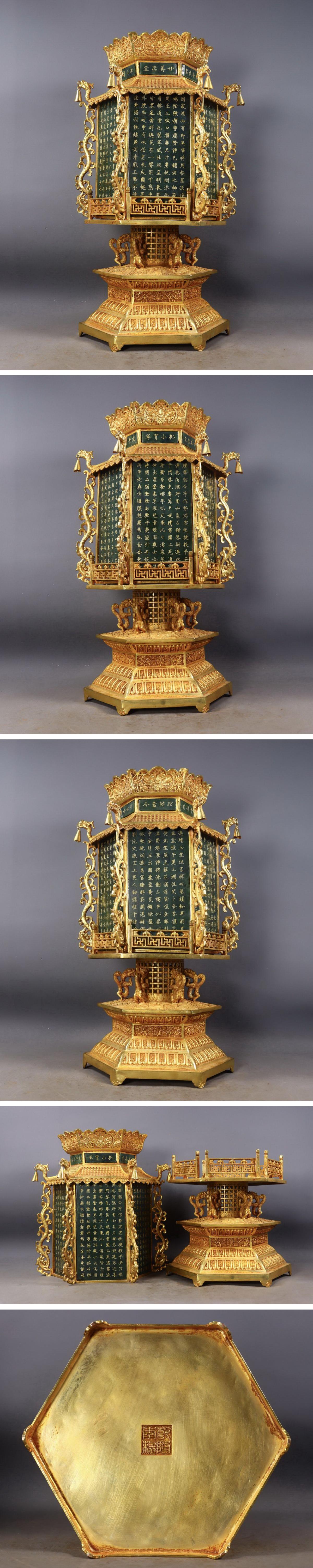 【清】関西某オークション購入 中国・清時代 銅金象嵌和田碧玉 漢詩紋宮灯 極細工 古置物 古擺件 中国古美術7L12-OE8