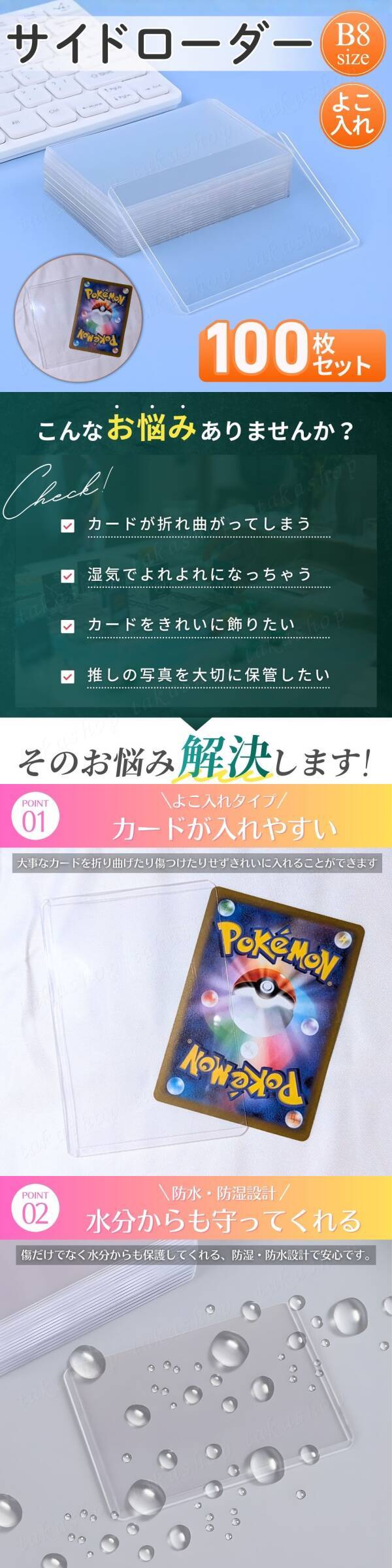 | 商品説明 | ご覧いただきありがとうございます! ●商品説明 横入れタイプのサイドローダー100枚セットです。 ポケカ、遊戯王、デュエルマスターズ、ドラゴンボールヒーローズ、デジモンカード、トレカ、ファンカード、推しの写真、プロ野球、ウマ娘アイドルの写真などにご使用いただけます。 基本的には一般的なトレーディングカードでしたらご使用いただけます。 ●商品特徴 1.横入れタイプ 2.B8硬質タイプでしっかり保護 3.曲がりを防げるので、カード対戦での使用もOK! 硬質なPVC素材を使用しており、カードの変形や折れを防ぎます。 個別に収納できるサイドローダーは、紛失やキズからカードを保護し、防水仕様で雨やほこり、湿気からしっかりとガードします。 両面が透明なので、カード本来の美しさを損なわずに鑑賞できます。 横からカードを挿入する方式で、コレクションの展示、収納、整理、差し替えが便利に行えます。 カードの四隅の折れも防ぎ、カードの交換や郵送時の持ち運びにも便利です! カードの収納だけでなく、ショップなどでのディスプレイにもおすすめです。 ●使い方 大切にしたいカードを横から入れてください。 スタンドを使ってディスプレイすることもできます。 ●商品詳細 サイズ 外寸:横約7cm×縦約10.1cm 内寸:横約6.7cm×縦約9.5cm 厚さ:約2mm カラー:クリア(透明) 数量:100枚 ●発送について 【ゆうパケットポストで発送します】 発送日:お支払い後1〜3日以内(平日) 到着目安:発送後2〜4日程度 ※商品はポストに投函されます ※遠方の方はもう少しかかる場合もございます 【配送方法の変更はできません】 ●お願い ・専用/取り置き/セット等には対応しておりません、そのまま購入して下さい ・商品画像の転載や説明文のコピーはお止め下さい ※見つけたら通報しています ・ 海外製品のため、細かな汚れや傷がある場合があります。また、画像と実物の色合いが異なる場合がございますので、予めご了承ください ・ 即購入OK ・ コメントなしOK 〇初期不良は対応しますので、何かあれば「評価前に」ご連絡下さい |