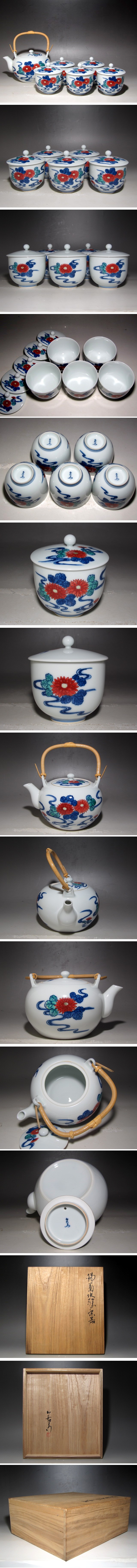 人間国宝 十三代今泉今右衛門作の錦菊水絵茶器です。 絵付けが大変美しい、趣ある作品です。 【十三代今泉今右衛門(いまいずみいまえもん)】 若い頃から創作的な色鍋島の制作に取り組み、現代の角度からの色鍋島に意欲を燃やした。 昭和50年、十三代を襲名し、改めて「色鍋島今右衛門技術保存会」をつくり、重要無形文化財の総合指定を受けた。 十三代らしい作品をと研鑽に努め、染付吹墨・薄墨吹墨の技法を確立し、その作品は伝統工芸展での優秀賞、日本陶芸展での秩父宮賜杯、毎日芸術賞、日本陶磁協会金賞を受賞するなど高い評価を得、平成元年には重要無形文化財「色絵磁器」保持者(人間国宝)の認定を受けた。 サイズ 急須・・直径17cm/高さ19cm 湯・・直径8.5cm/高さ9cm(多少の誤差はお許しください) 状態 一見して疵やヒビ・直しは見られません。 骨董品という事をご勘案頂き、時代経過のスレや、小さな傷がある場合があるかもしれませんのでご承知置きください。 | |||