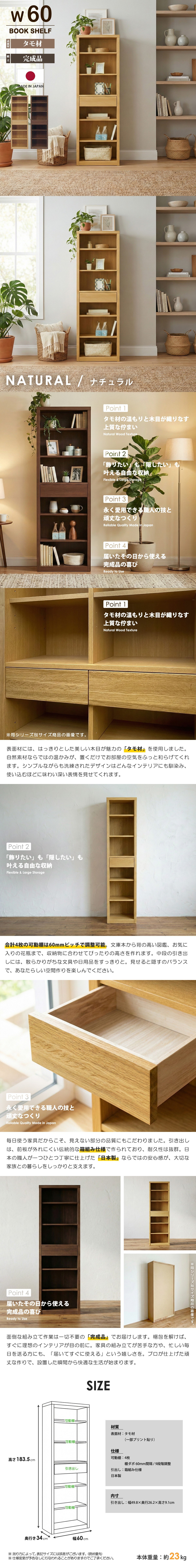 | 特 徴 | タモ材の美しい木目が空間に温かみを添える、日本製のフリーボード。 幅60cmのスリム設計で、本棚としてはもちろん、お気に入りのコレクションを飾るディスプレイラックとしても活躍します。小物整理に便利な引き出しも備え、見せる収納と隠す収納を両立させました。 | | 商品サイズ | 本体:幅60×奥行34×高さ183.5cm 引き出し内寸:幅49.8×奥行26.2×高さ9.1cm