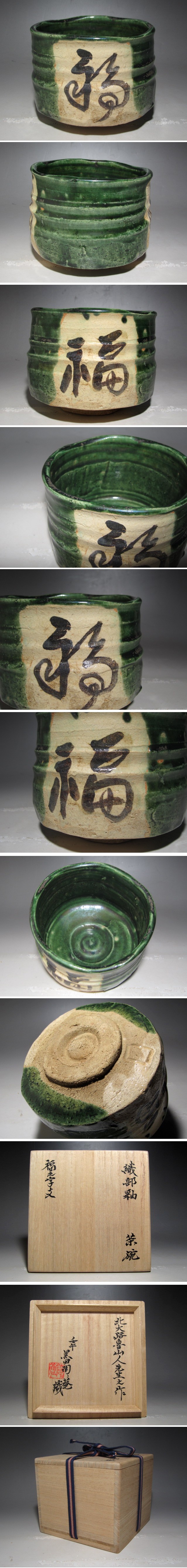 北大路魯山人作の織部福字茶碗です。 趣のある見事な出来栄えの逸品です。 箱蓋裏に黒田陶々庵の極めがあります。 【北大路魯山人(きたおおじろさんじん)1883-1959】 陶芸家。京都上賀茂出身。 近代美術史の中でも異色の芸術家で、篆刻家・画家・陶芸家・書道家・漆芸家・料理家・美食家などの様々な顔を持っている。 大正期に「美食倶楽部」「星岡茶寮」を創業し、使用するすべての食器を創案製作。以後ひたすら陶芸に没頭する。 織部焼の重要無形文化財保持者(人間国宝)に指定されるも辞退。 サイズ 直径13cm/高さ10cm(多少の誤差はお許しください) 状態 一見して疵やヒビ・直しは見られません。 骨董品という事をご勘案頂き、時代経過のスレや、小さな傷がある場合があるかもしれませんのでご承知置きください。 | |||